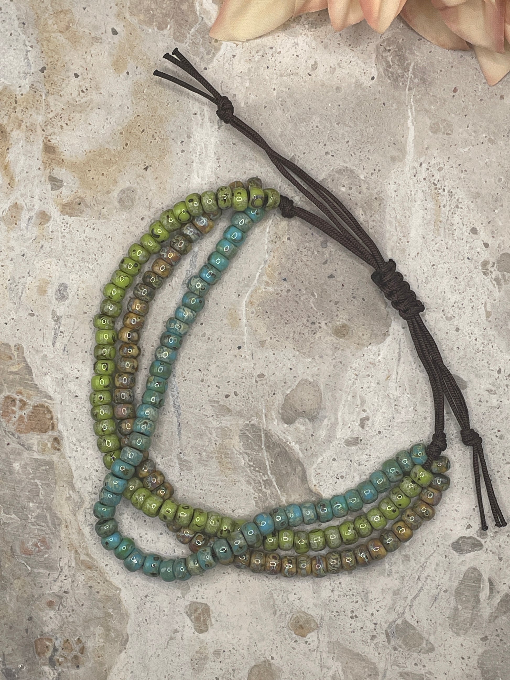 Add a pop of playful color to any outfit with our adjustable 3-stranded beaded bracelet! Featuring a mix of Picasso seafoam green, chartreuse, and brown tan Miyuki seed beads on a durable 2mm nylon cord. Perfect for a fun and unique accessory. (Bead-dazzle your wrist with this quirky bracelet!)