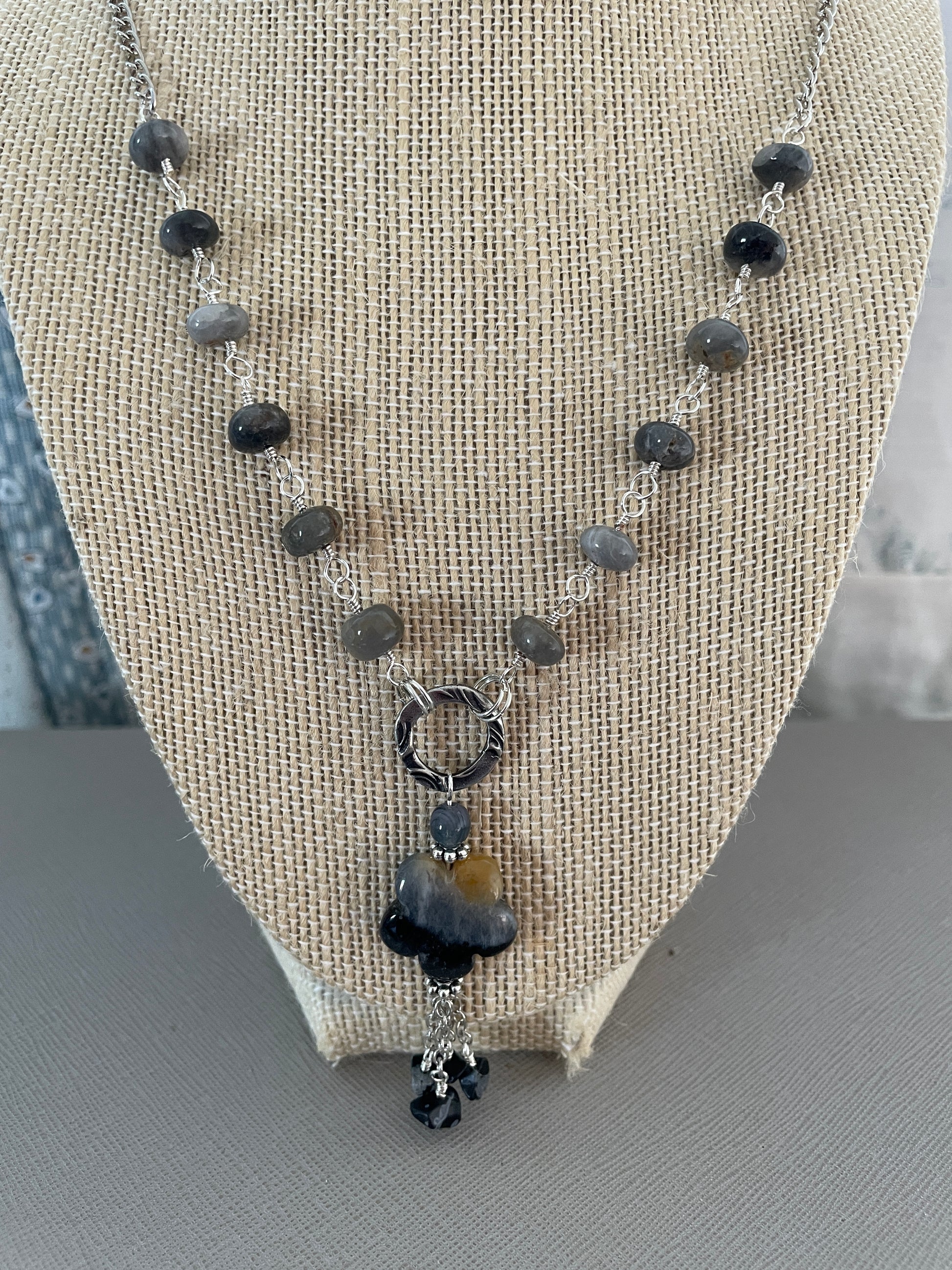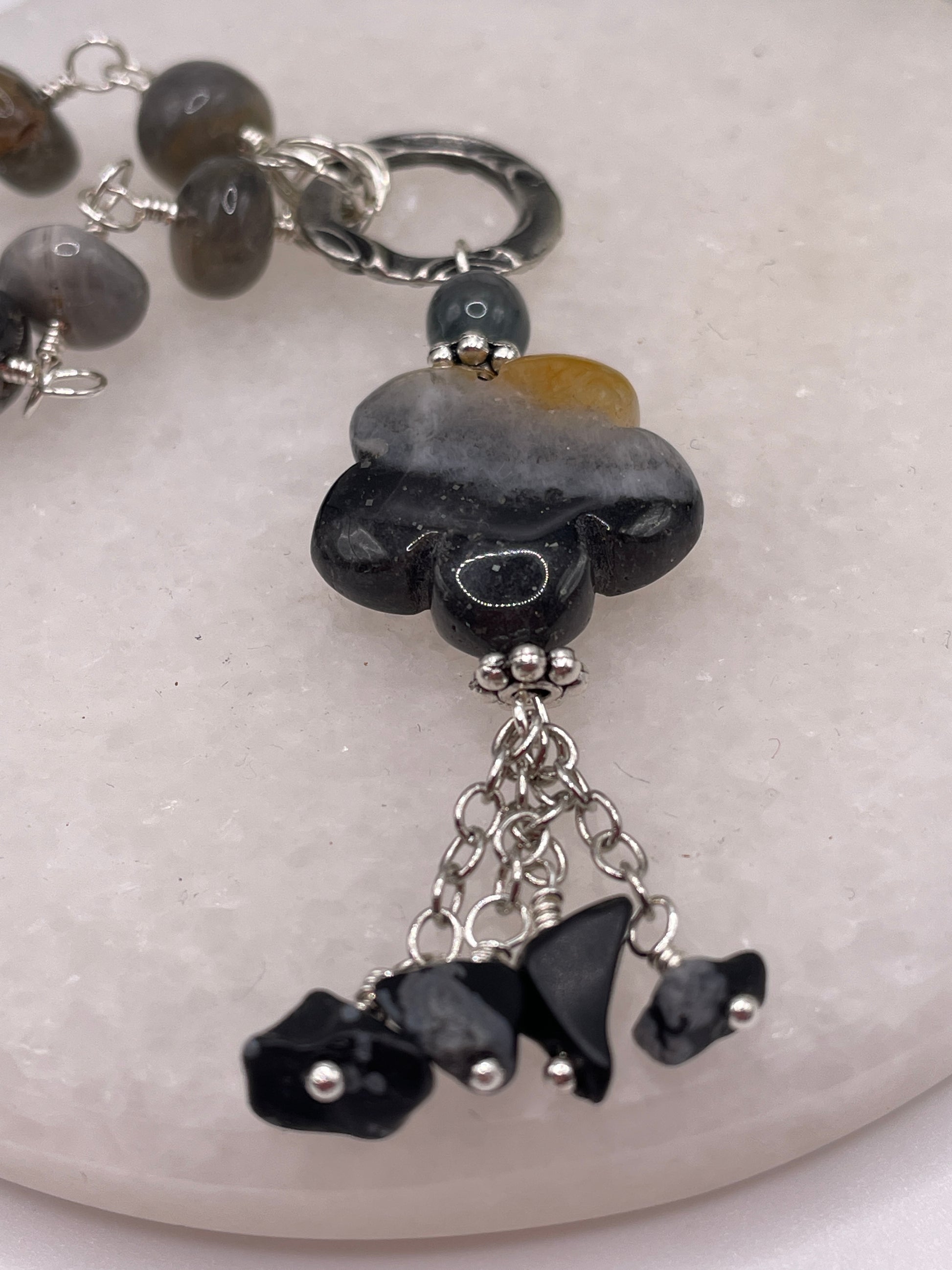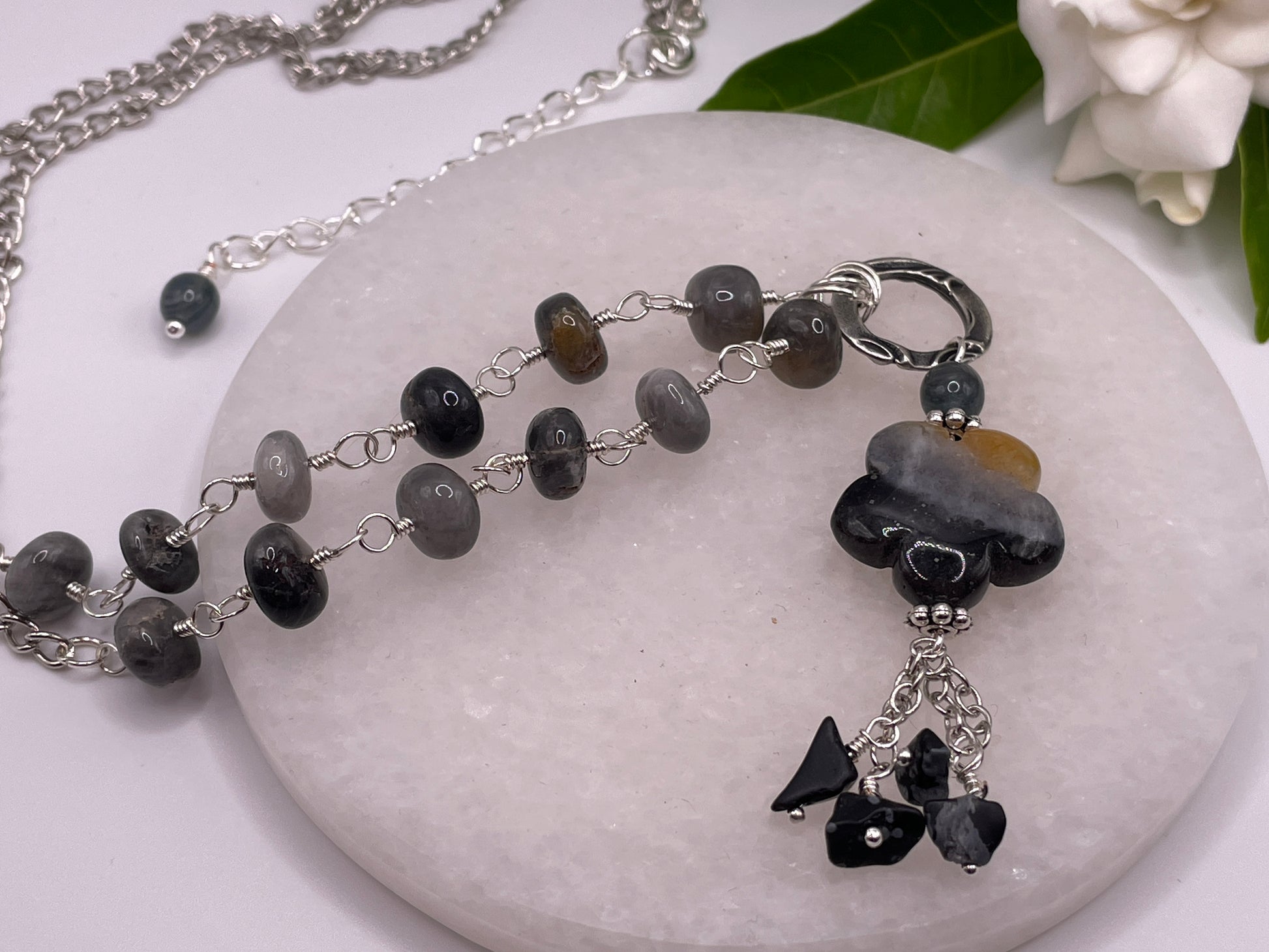 | Introducing our exquisite Amazonite Hand Carved Flower necklace, adorned with captivating Indian-Cut Hawk Eye Smooth rondelles. Crafted with precision, this stunning piece is elegantly displayed on a silver plated chain. Elevate your jewelry collection with this timeless treasure. 60cm in length |