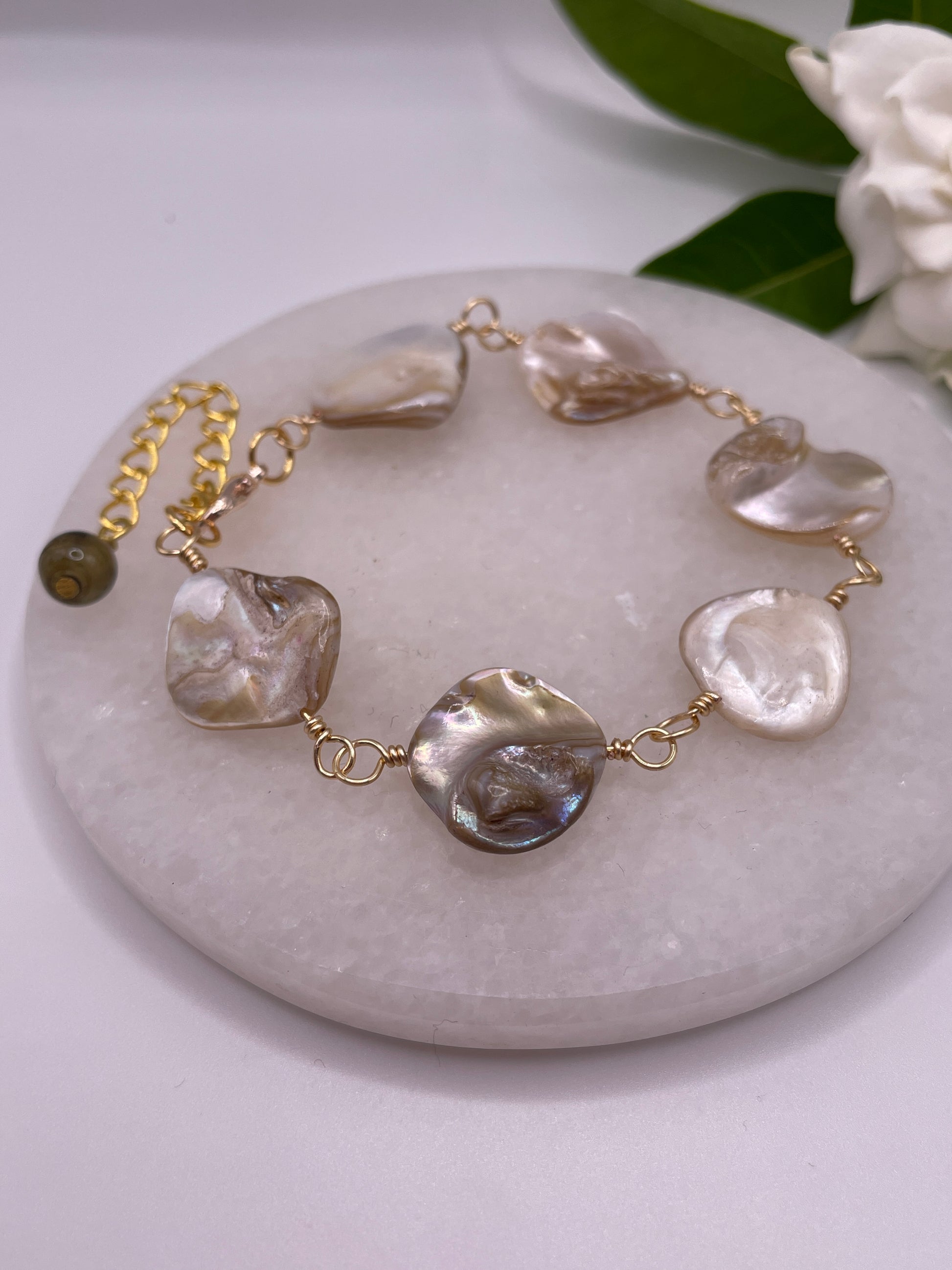 Introducing our Baroque Shell Bracelet, a chic and whimsical addition to your jewelry collection. Adorned with lustrous pearls, it's elegance meets playfulness.