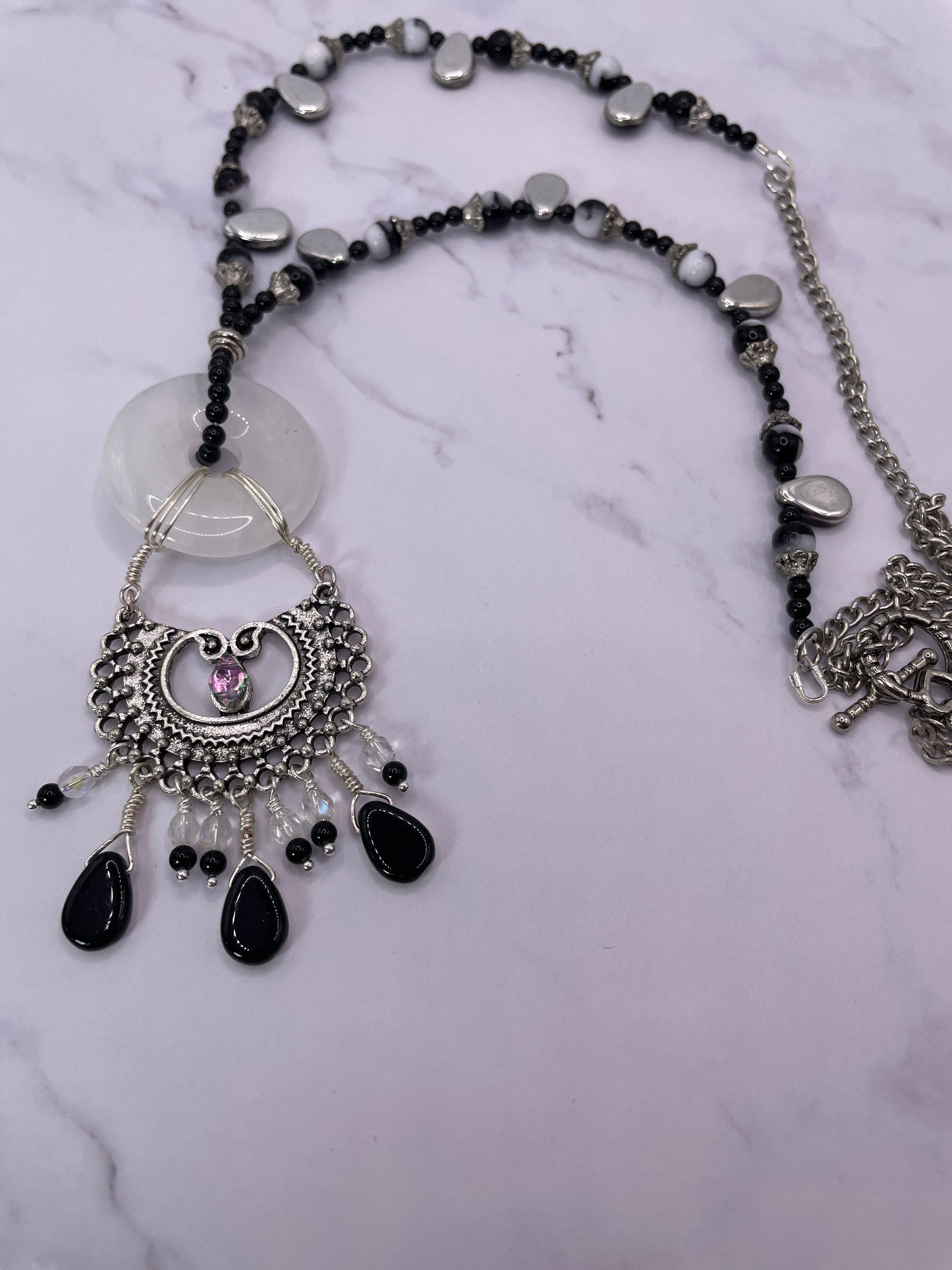 Unleash your wild side with our Bohemian Style Quartz Donut Necklace! This daring piece features an antique silver plated focal, along with a stunning Quartz Donut and pear brio for added flair. The 3mm black onyx rounds and faceted Czech Glass crystals add a touch of edginess to complete the look. Embrace adventure and make a statement with this unique necklace!