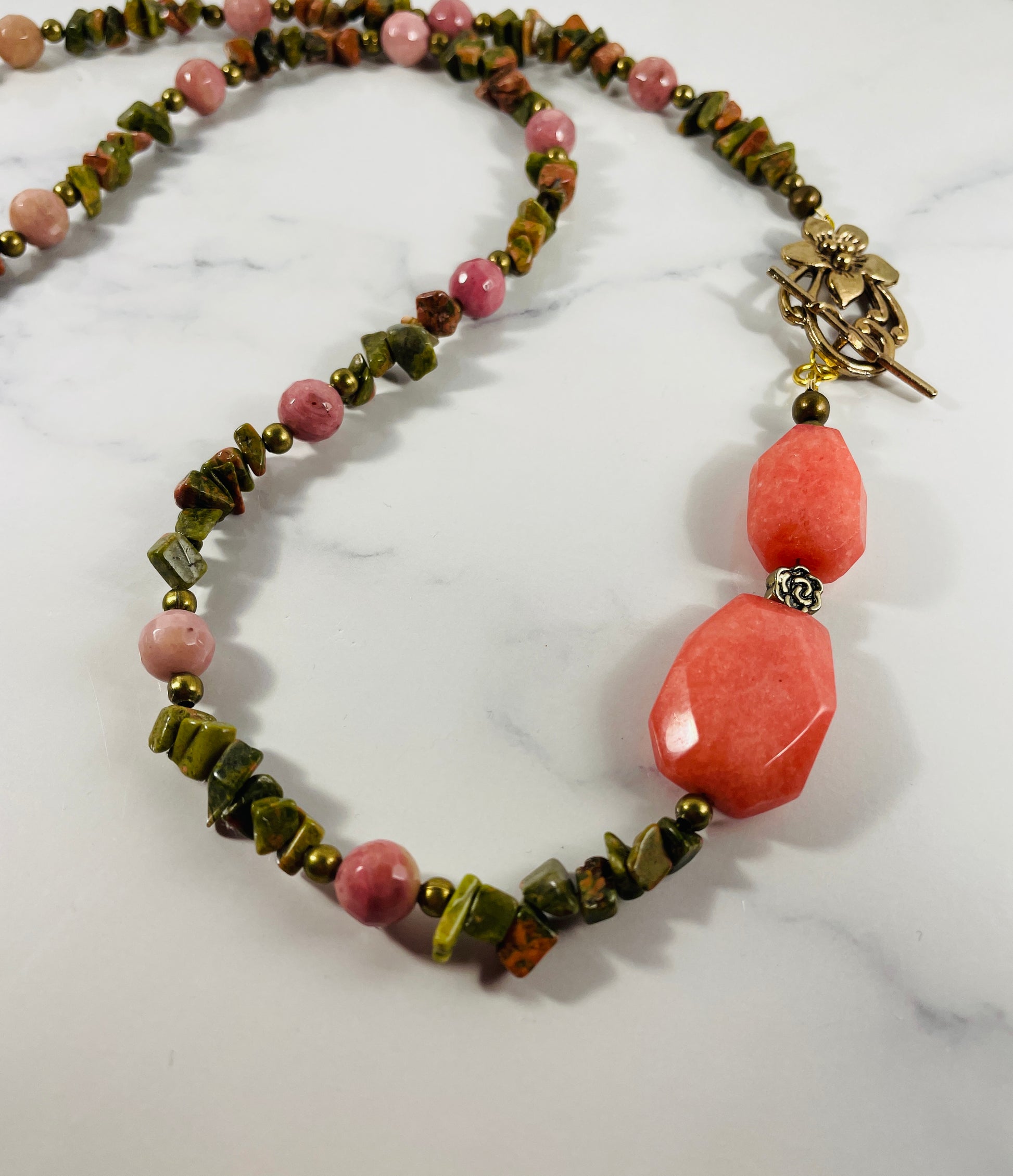 Measures 68cm (27") in length Sections of Unakite gemstone chips and 8mm Pink Rhodonite featuring Candy Jade nuggets, largest is 25x18mm. Is finished of with an Antique Gold flower toggle clasp.