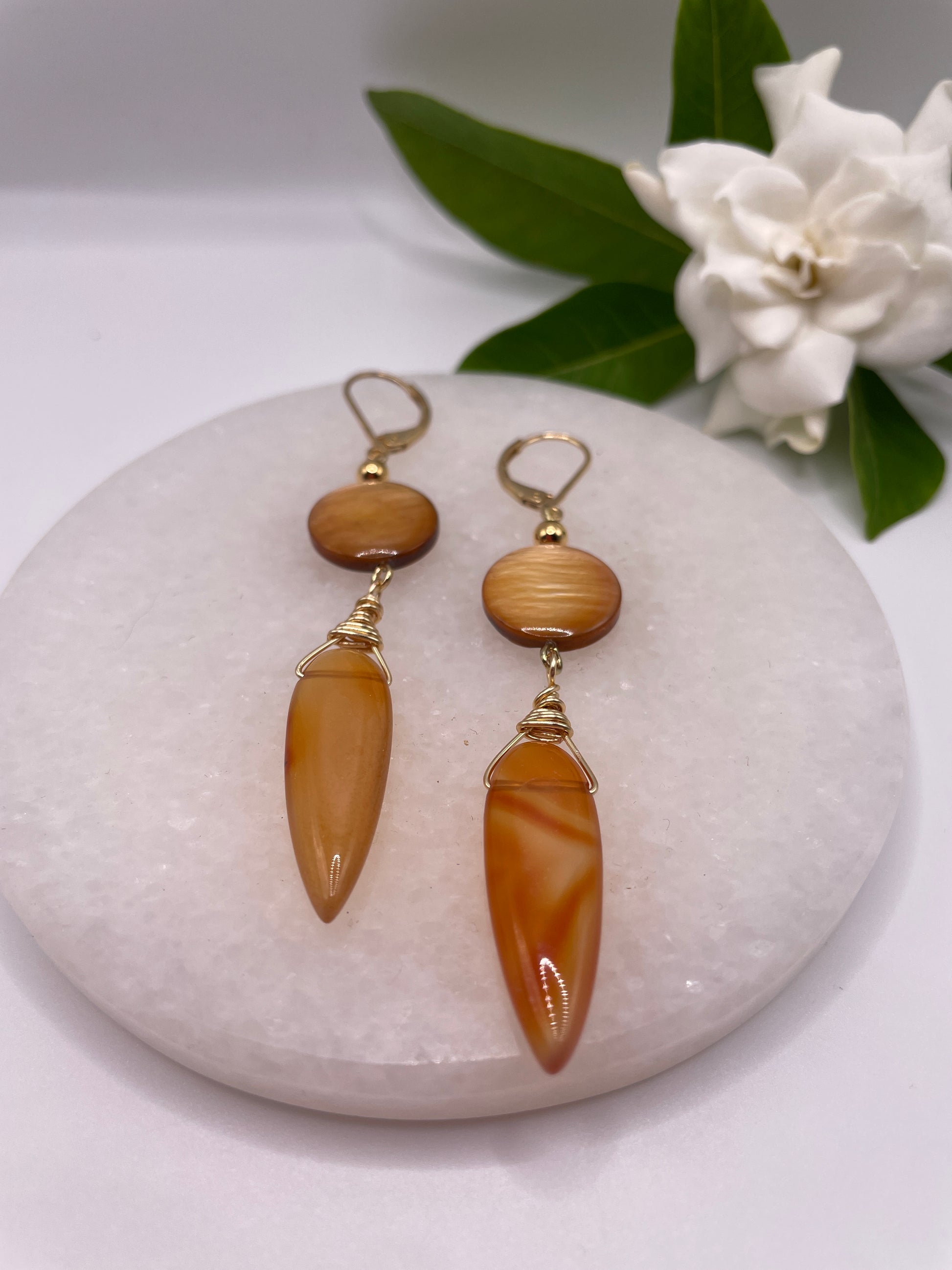 | Introducing Carnelian Pear Brio Earrings, where elegance meets earthy charm! These dainty earrings feature beautiful Carnelian brio's dangling from golden wire wraps and a highly polished wooden disc bead, perfect for adding a touch of natural sophistication to any look. 7cm in length |
