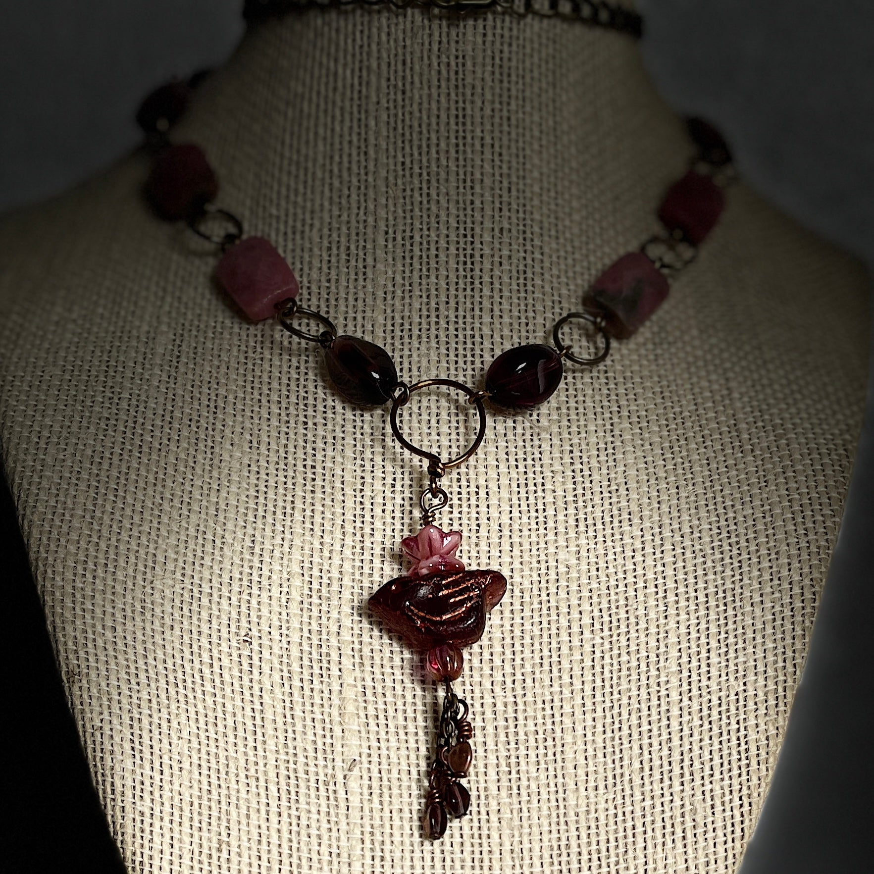 Measures 60cm (opera) Czech Glass carved bird 11x21mm on an Antique Brass chain that has 14x10x3mm Rhodonite faceted rectangle beads linked with dark amethyst dimpled ovals.