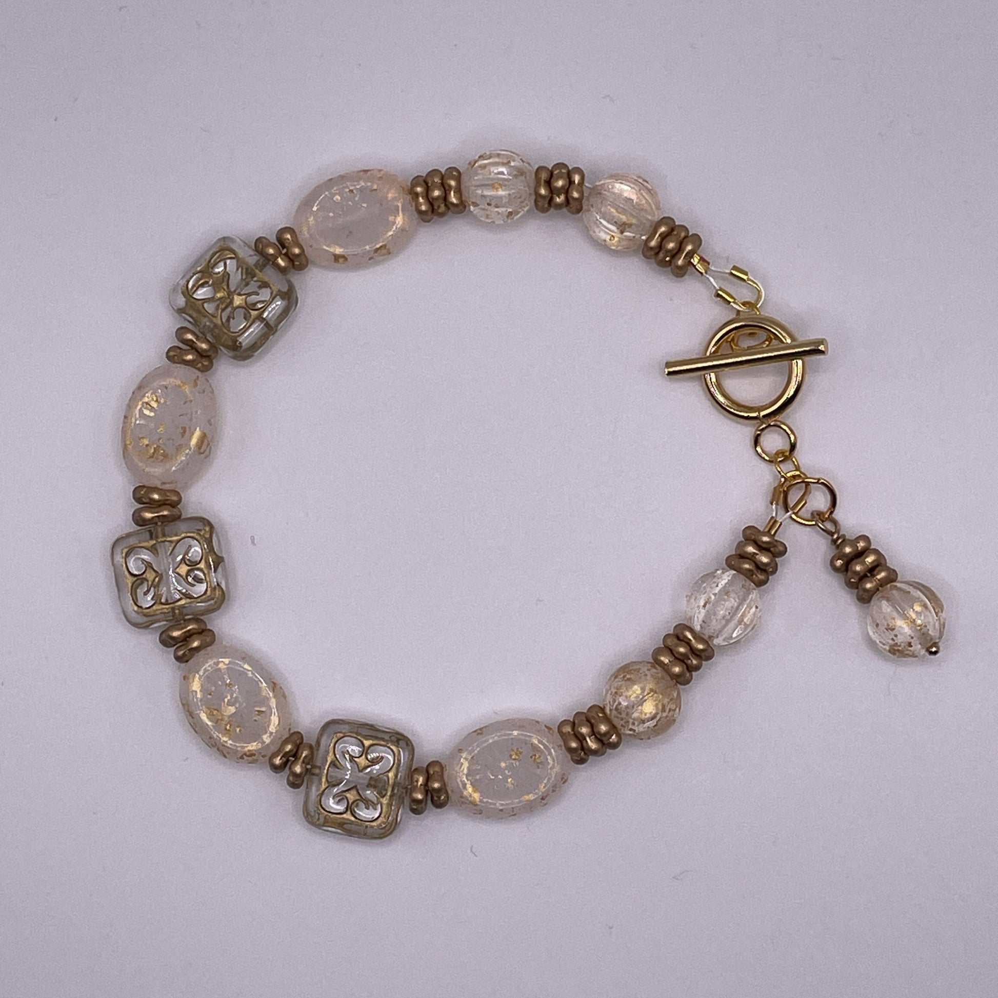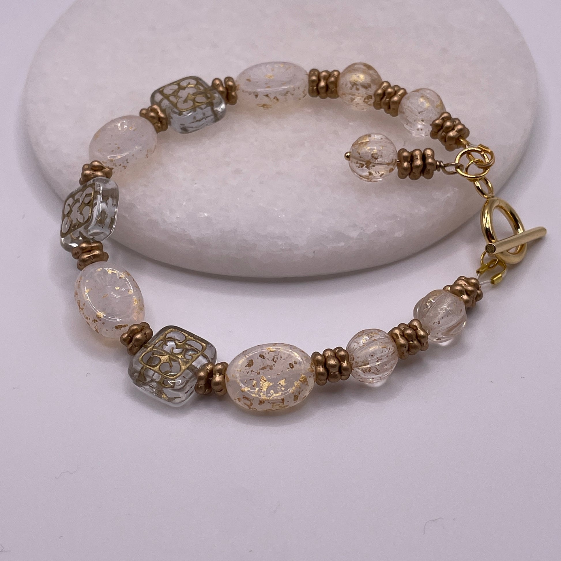 Champagne Taste Bracelet Measures 21cm (8.5"). Czech Glass Kiwi ovals, 8mm Czech Glass melons with Czech Glass ornate rectangles with gold coloured daisy spacers in between, finished off with a plain gold plated toggle clasp.