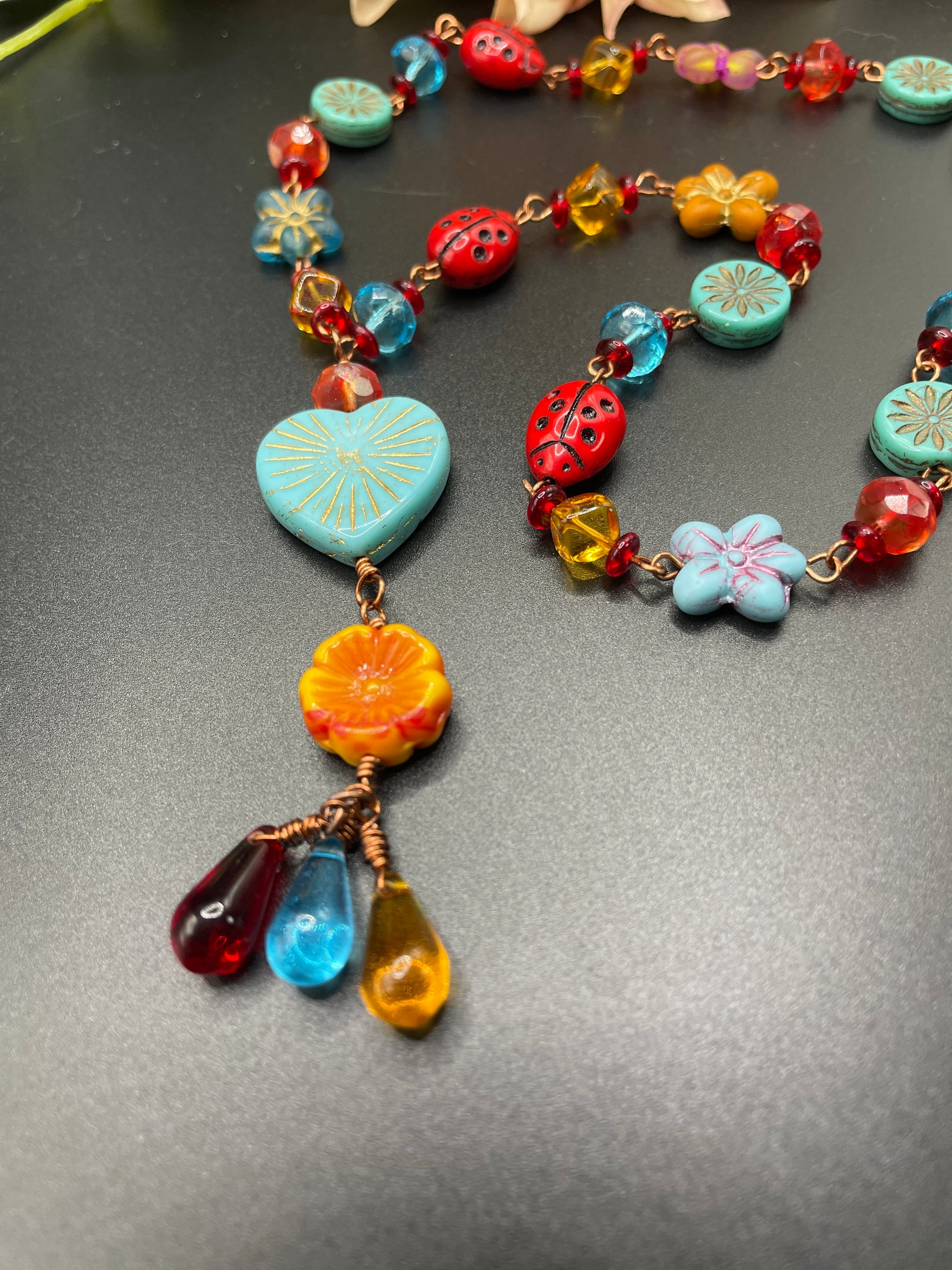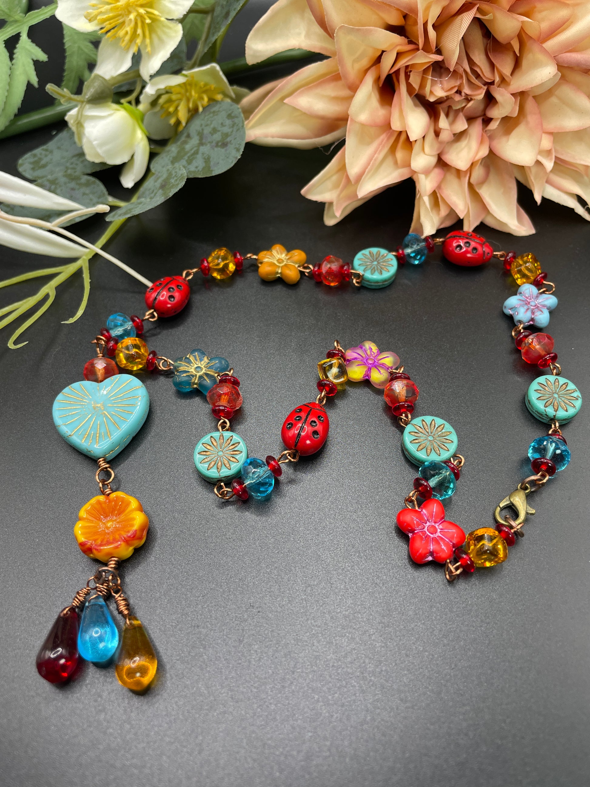 Adorn yourself with this whimsical necklace featuring a Czech Glass Heart focal, Czech Glass Aster and Hibiscus flowers, and a playful tear drop tassel. The colorful ladybug design is sure to add a touch of fun to any outfit. Perfect for nature lovers and those with a quirky sense of style!