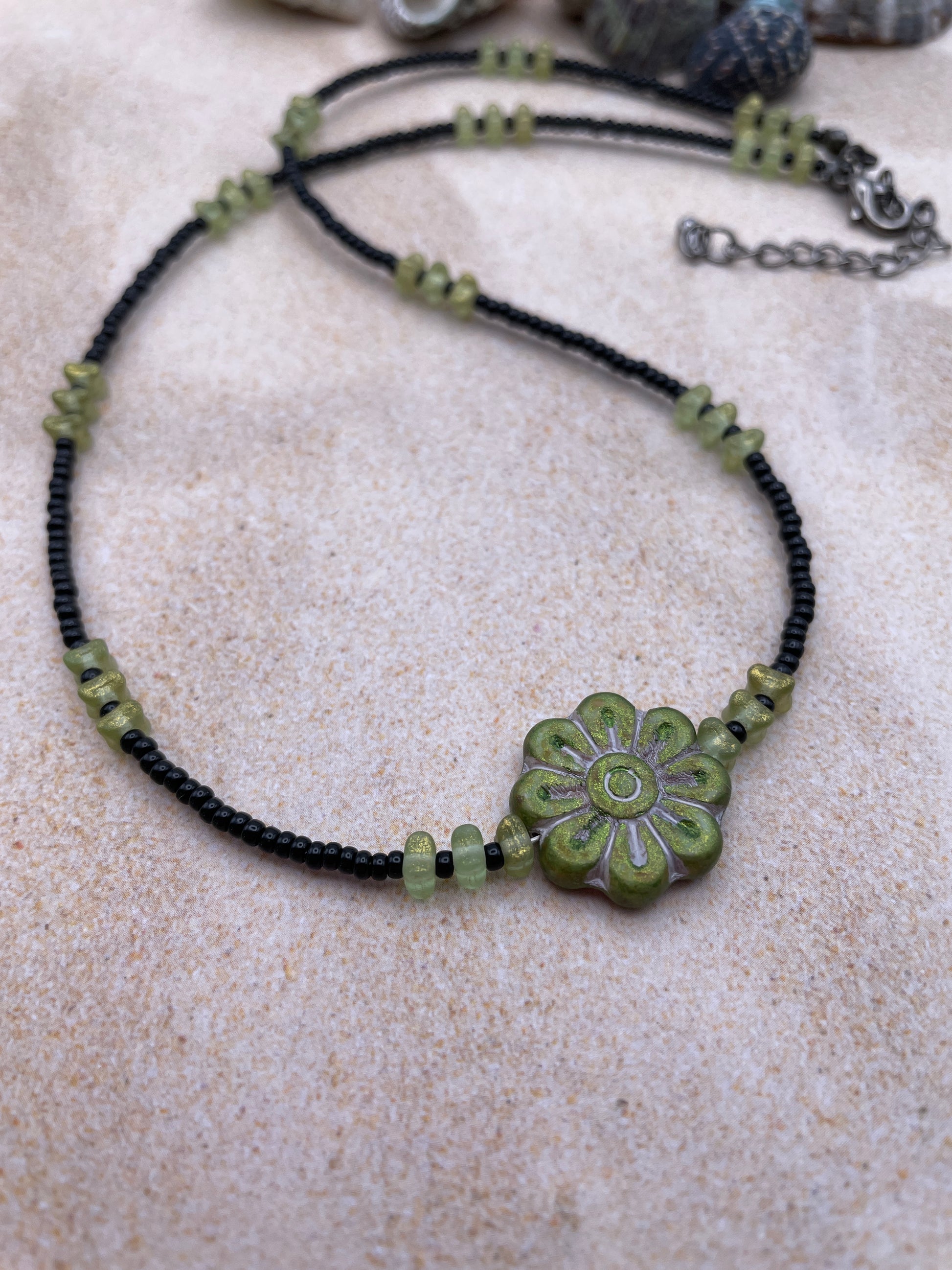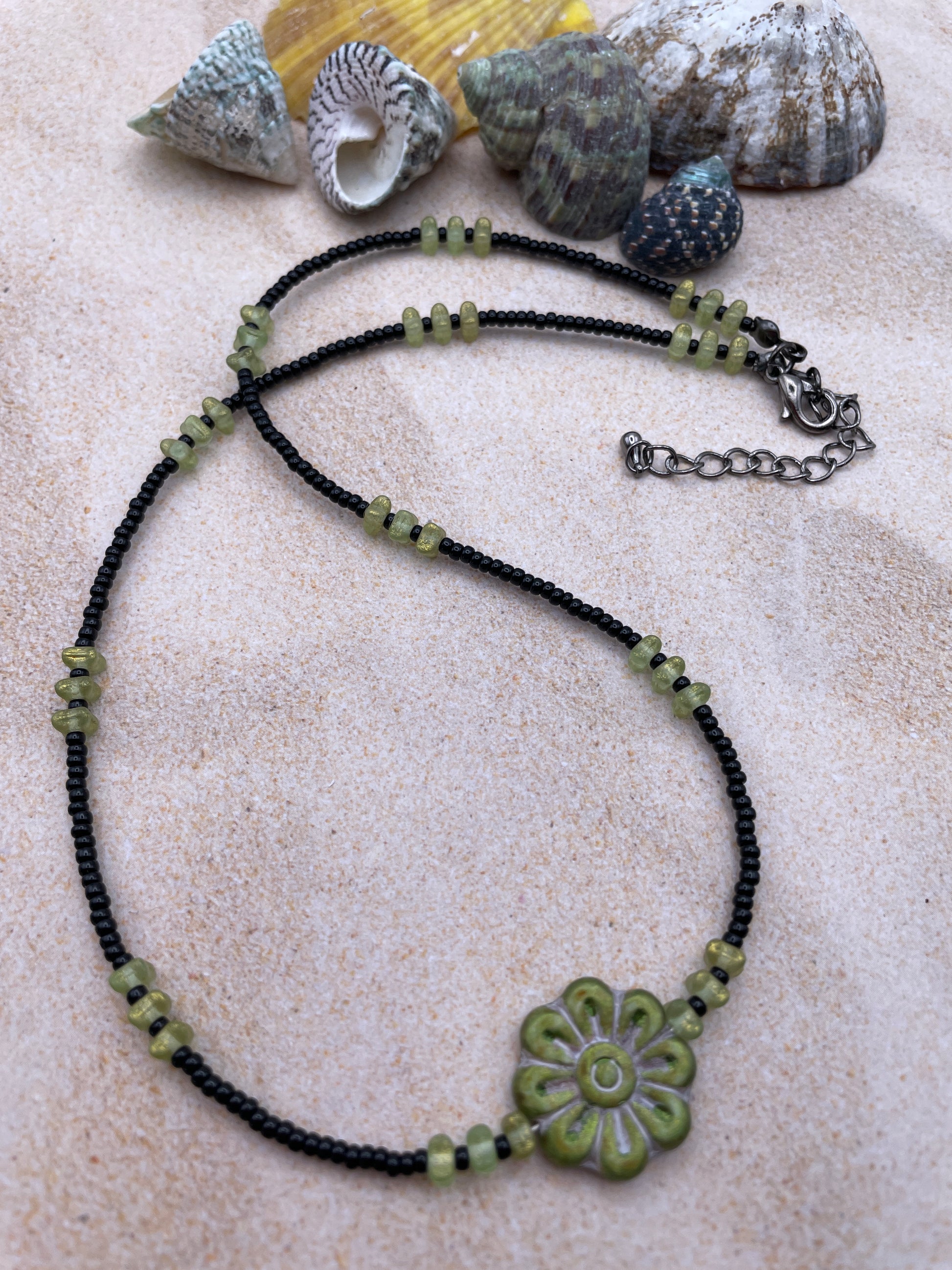 Embrace your playful side with our Daisy Green Necklace! Crafted with 18mm Czech Glass in a stunning white silk finish and accented with 4 point orion spacers and black Miyuki seed beads, this necklace adds a touch of charm to any outfit. With a 44cm chain and 6cm extender, it's perfect for any occasion.