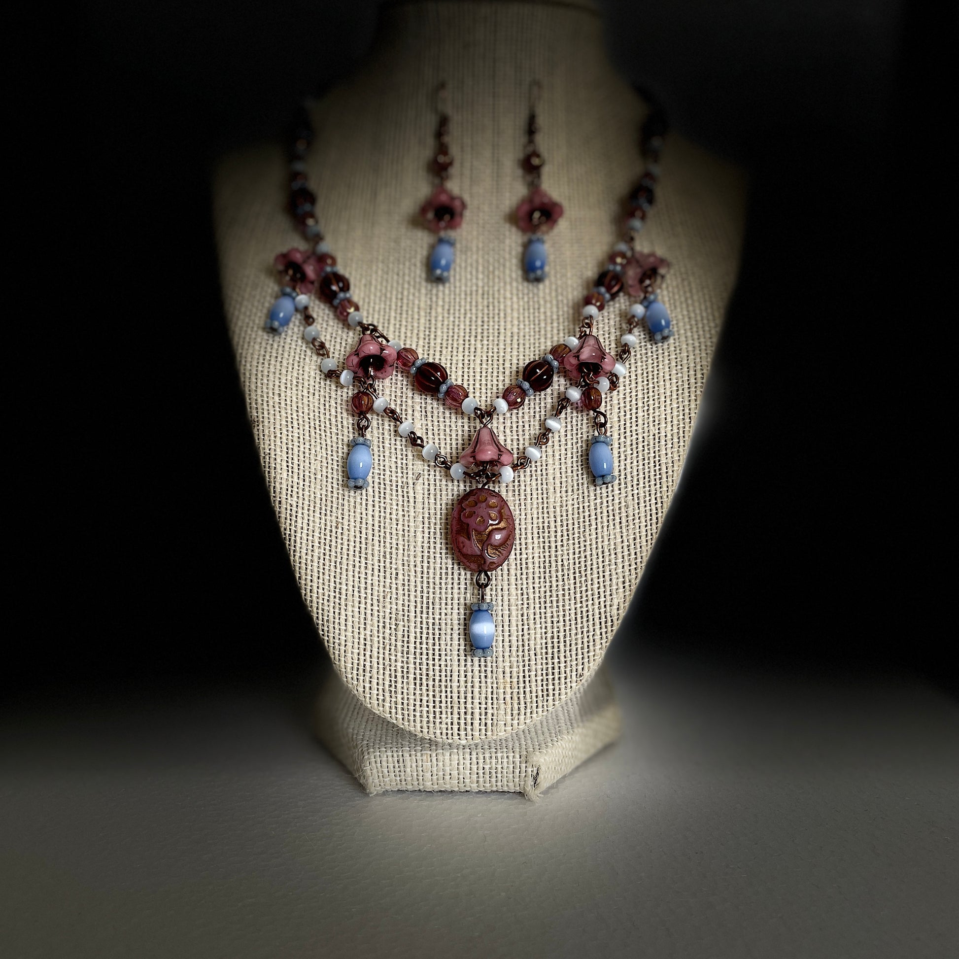 45cm in length. 16 x 20mm flower focal in a pink silk/crystal mix bronze finish. Pink bell flowers hang between drapes of 4mm pale blue cat eye. The beaded strand is made up of groups of 6mm and 8mm Czech glass melons with cornflower blue spacer and 4mm cat eye beads between. Pretty blue ovals hang from each bell flower. A lobster clasp completes the necklace. Earrings measure 5cm in length with antique brass plated ear wires.