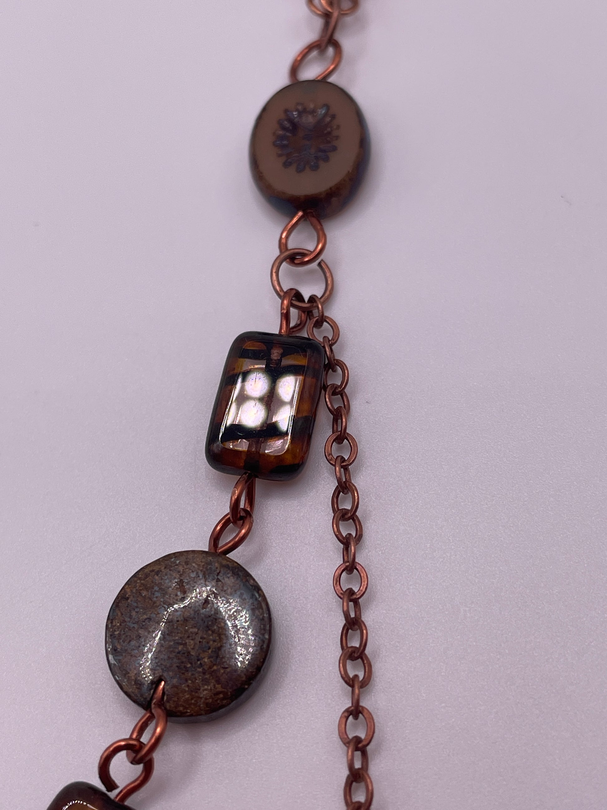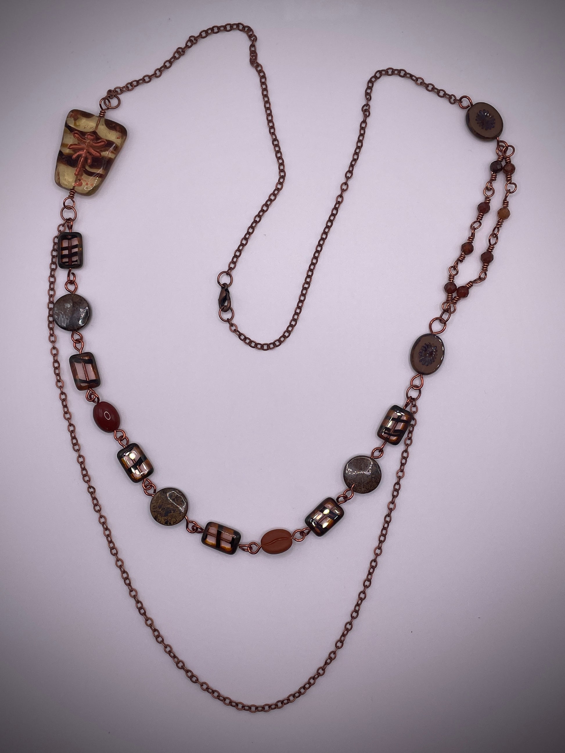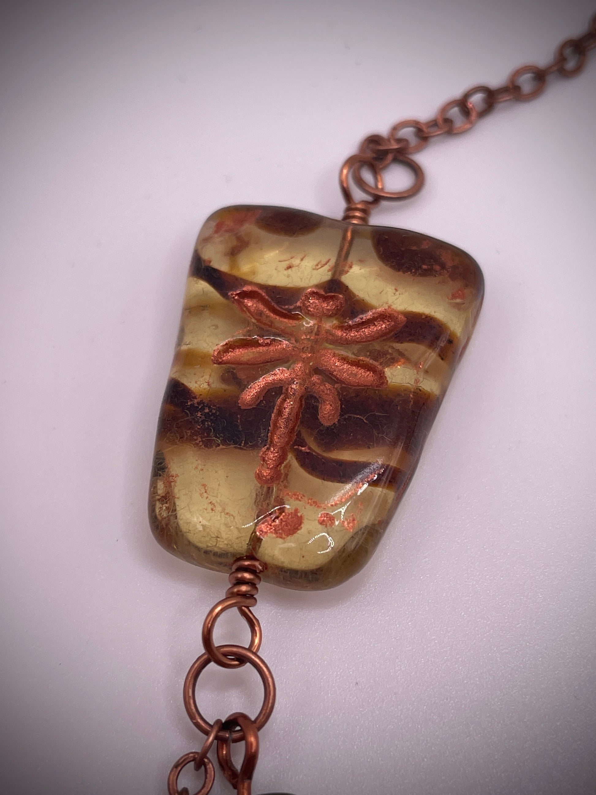 Introducing Dragonfly in Amber, a captivating necklace crafted with an exquisite blend of beads and chains. Featuring a long chain, adorned with a 20 x 26mm dragonfly etched bead that sits off-set two elegantly interconnected smaller beaded pieces. A stunning addition to any jewelry collection. Measures 37cm