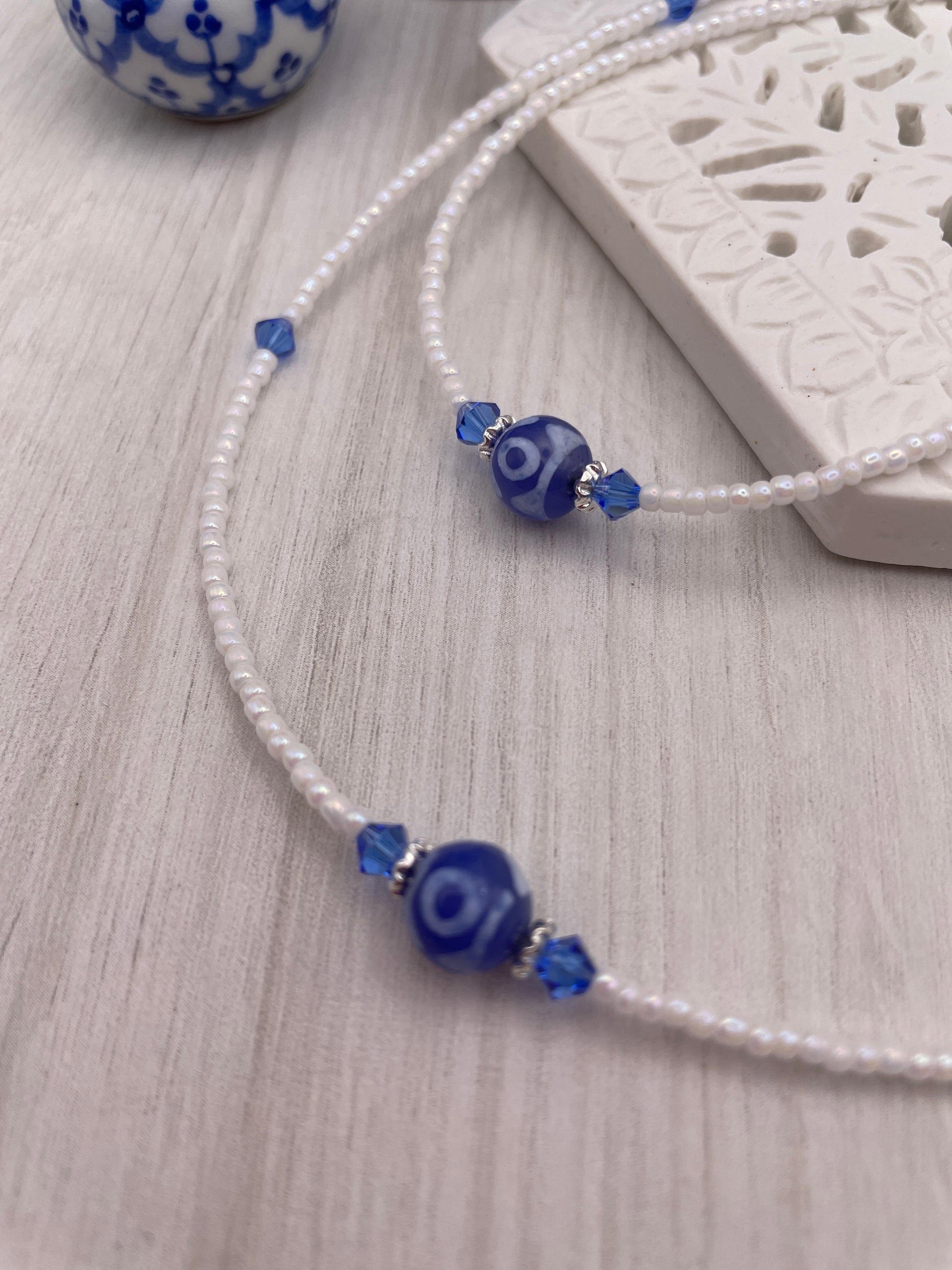 Discover the captivating beauty of the DZI Agate Blue Eye Set! Handcrafted with blue eye agate and adorned with sparkling Swarovski crystals and delicate seed beads, this set exudes elegance and charm. Enhance your outfit and channel positive energy all day long with this stunning jewelry.