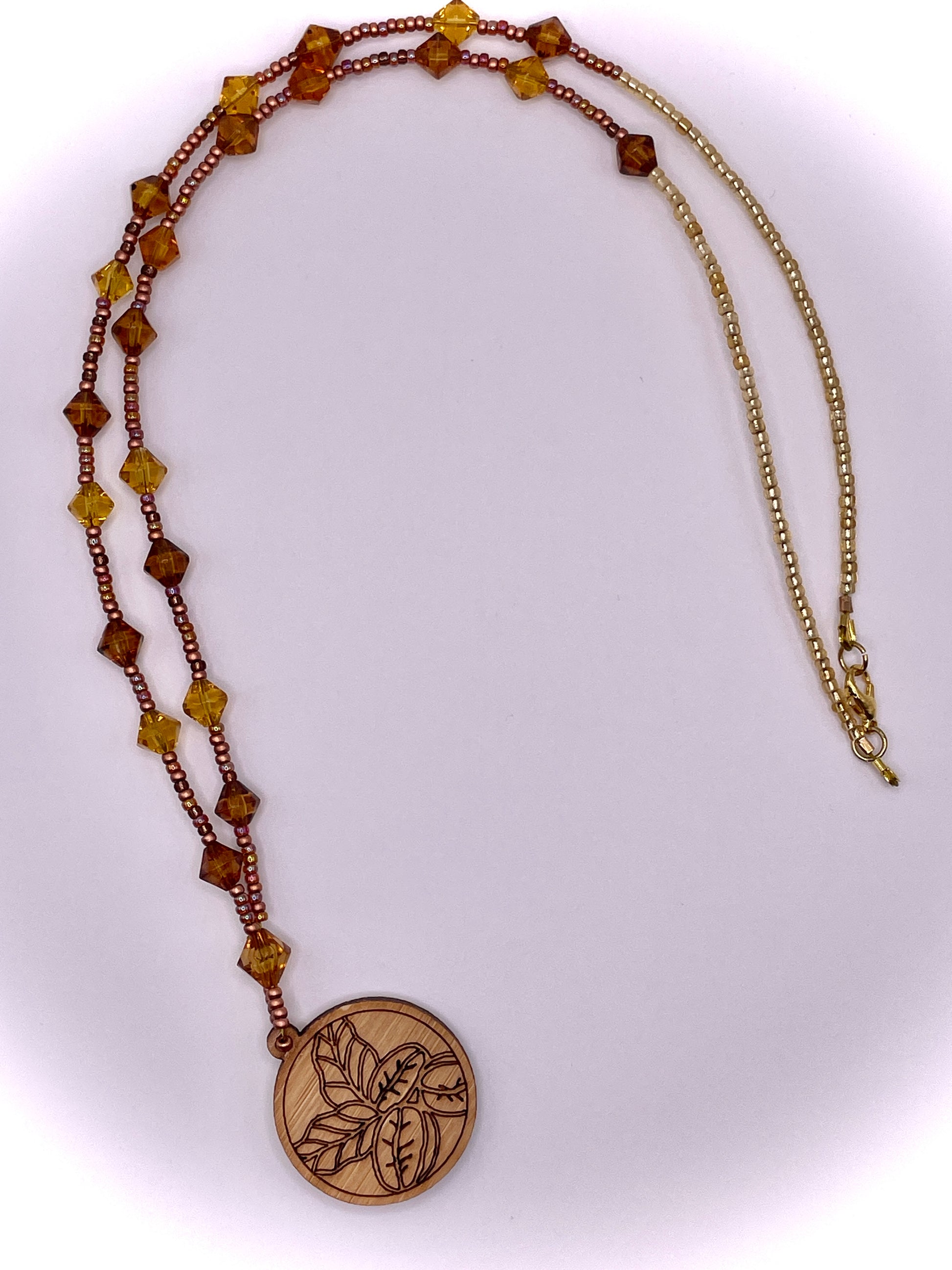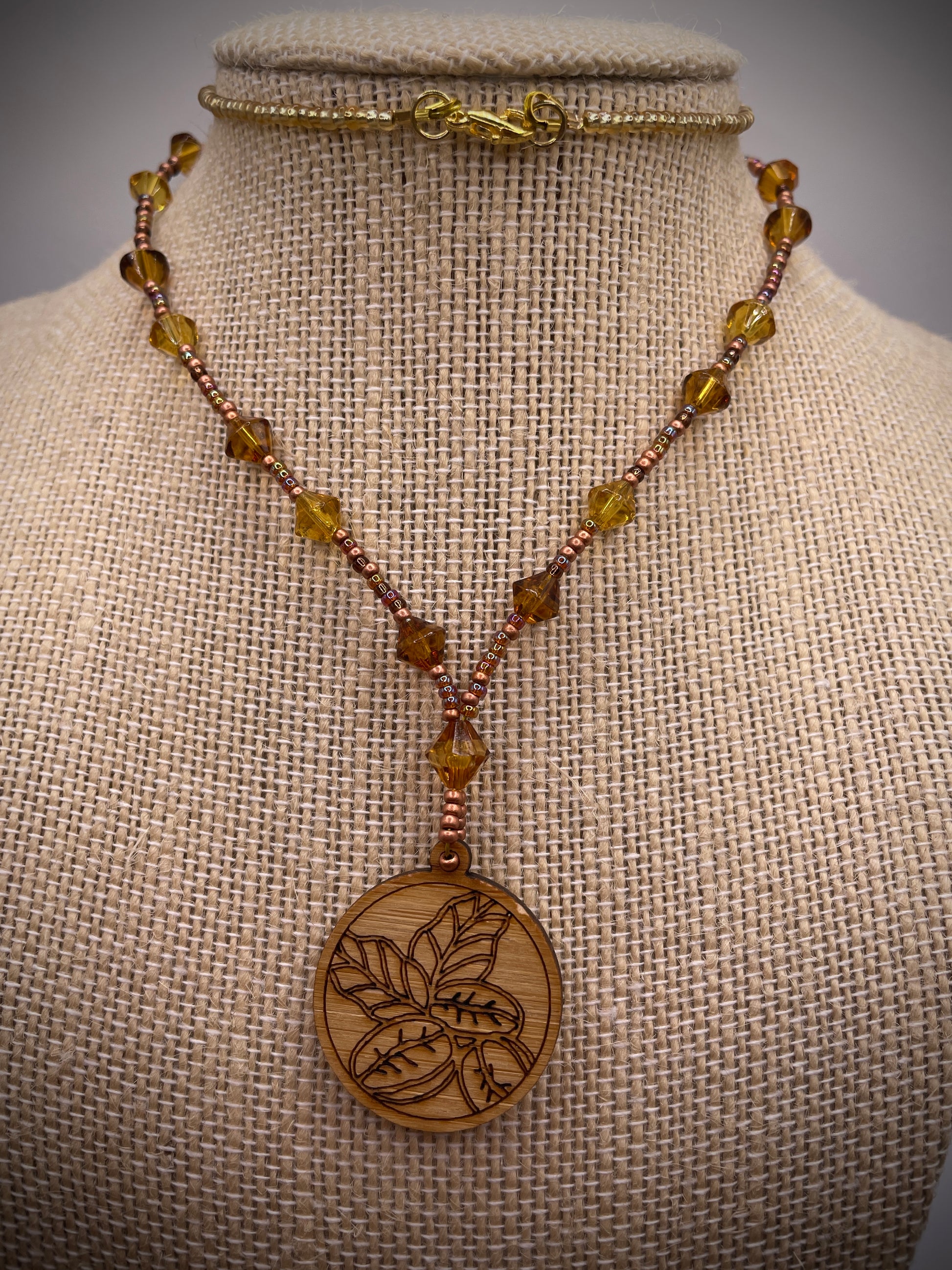 Introducing our Etched Bamboo Coffee Bean and Amber Necklace, a stunning piece of jewelry featuring a wooden pendant and amber coloured glass bicone, intricately designed with a touch of elegance. Perfect for any occasion. Measures 56cm.