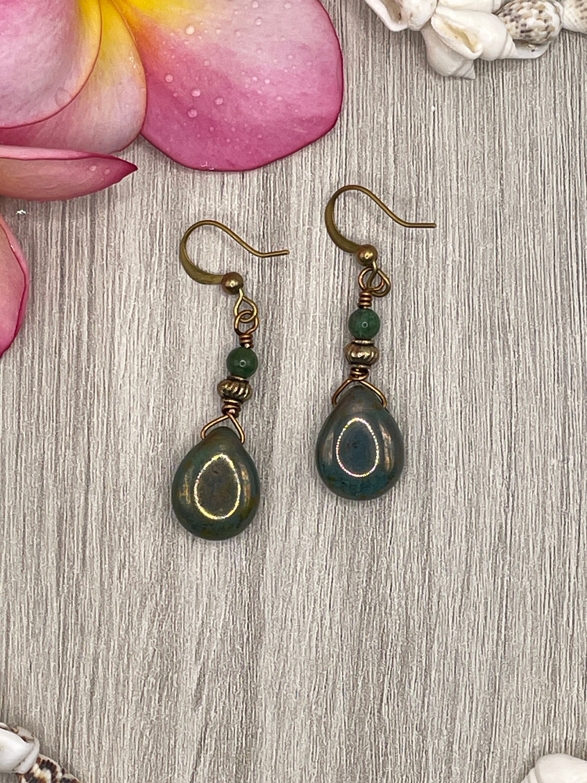 Green Opal Picasso Lustre Czech Glass earrings with French wire. The pear-shaped green glass stones are beautifully accented with antique brass plated beads. These dangle earrings are approximately 4.5cm in length, perfect for lobe wear. Handcrafted in Australia, these earrings are a unique addition to any jewelry collection and are ideal for those who love artisanal pieces.