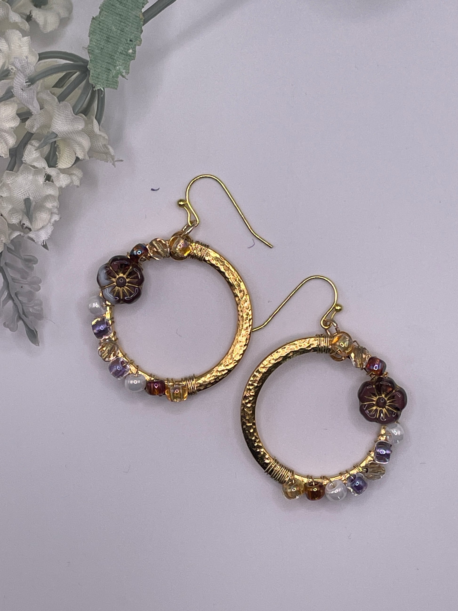 Get ready to add a touch of elegance to your outfit with these exquisite Hammer tone Hibiscus Wreath earrings. The intricate design of these hoop earrings features a beautiful wire wrapped flower shape wreath featuring a Czech Glass Table cut Hibiscus shaped bead. The earrings are made of high-quality materials, with a purple dyed main stone and secondary glass stone, all surrounded by a multi-tone gold-plated metal. These handcrafted earrings are 4cm in length and are perfect for lobe ear area. They are also nickel-free.. Although there is no seller warranty or information on the metal purity, these earrings are sure to make a statement. Made in Australia, these one-of-a-kind earrings are perfect for any occasion.
