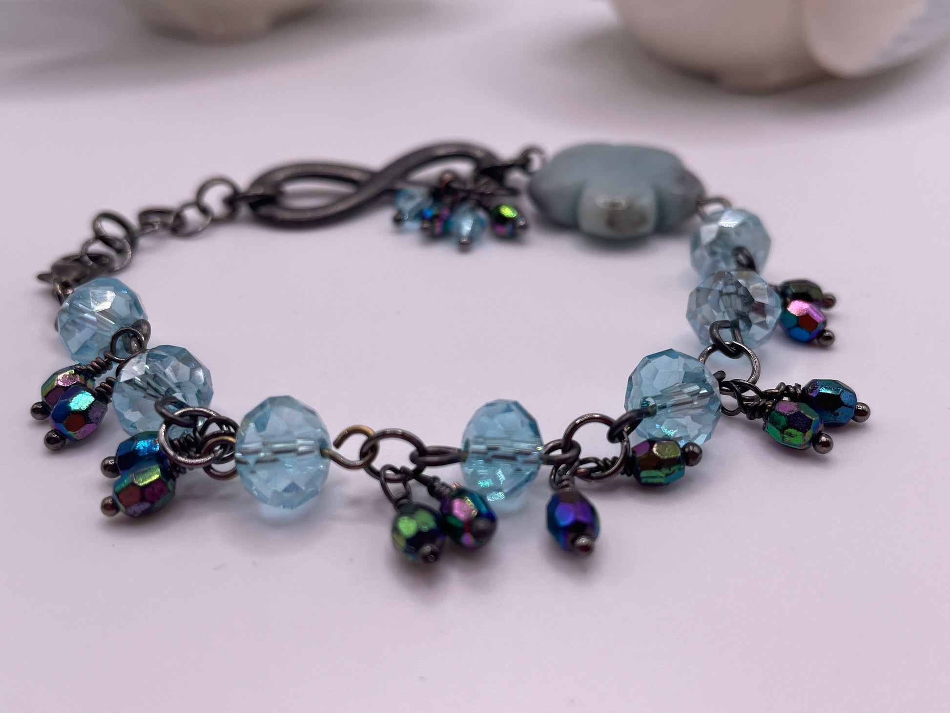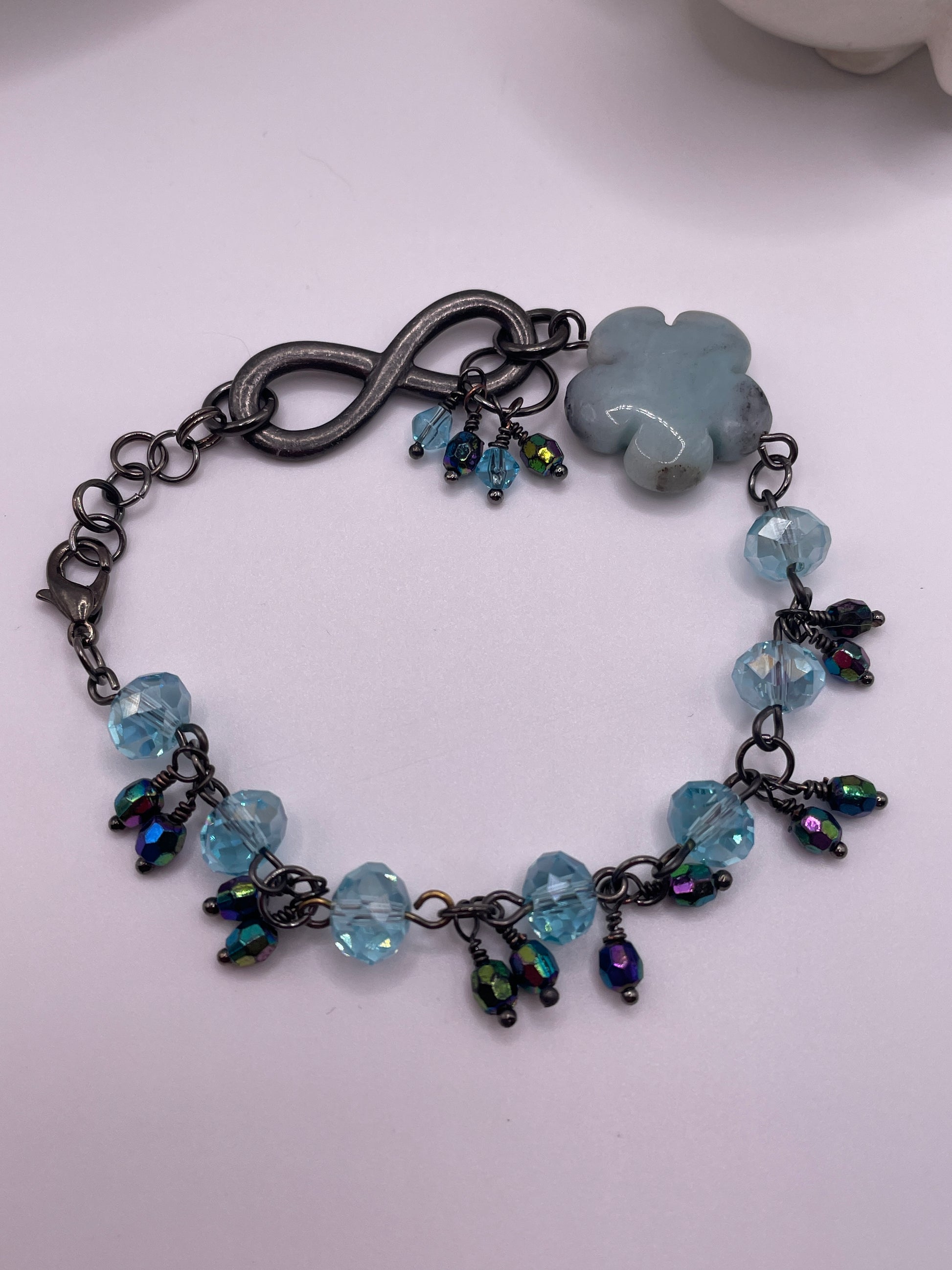 | Introducing our exquisite Amazonite Hand-carved Flower Bracelet, featuring captivating blue faceted Czech glass rondelles and a delicate hand carved flower bead. Crafted with precision, this elegant piece showcases an infinity link gracefully adorning the end of the chain, secured with a convenient adjustable clasp. Elevate your style with this stunning jewelry accessory. Measures 19cm + 2cm extension. |