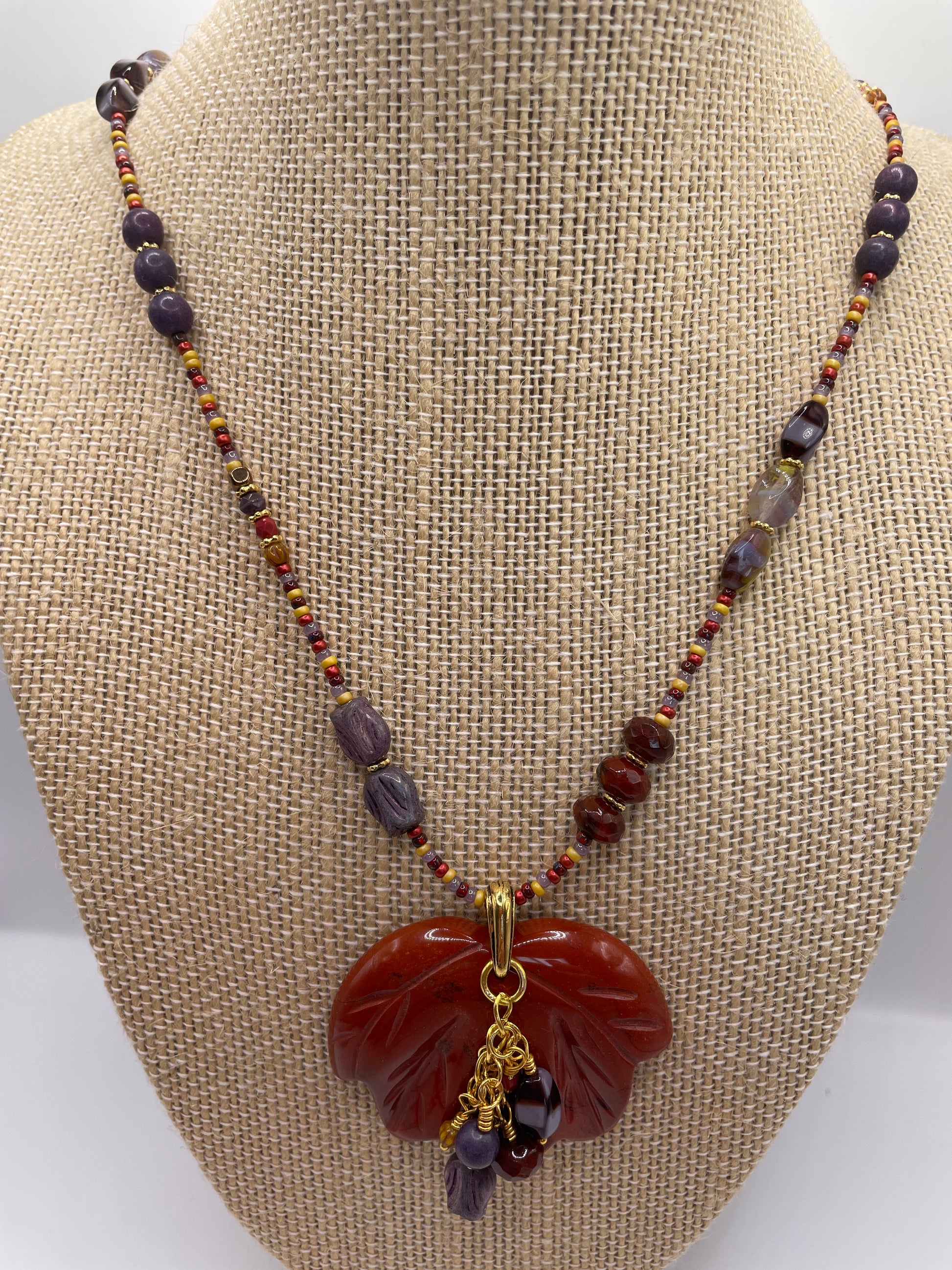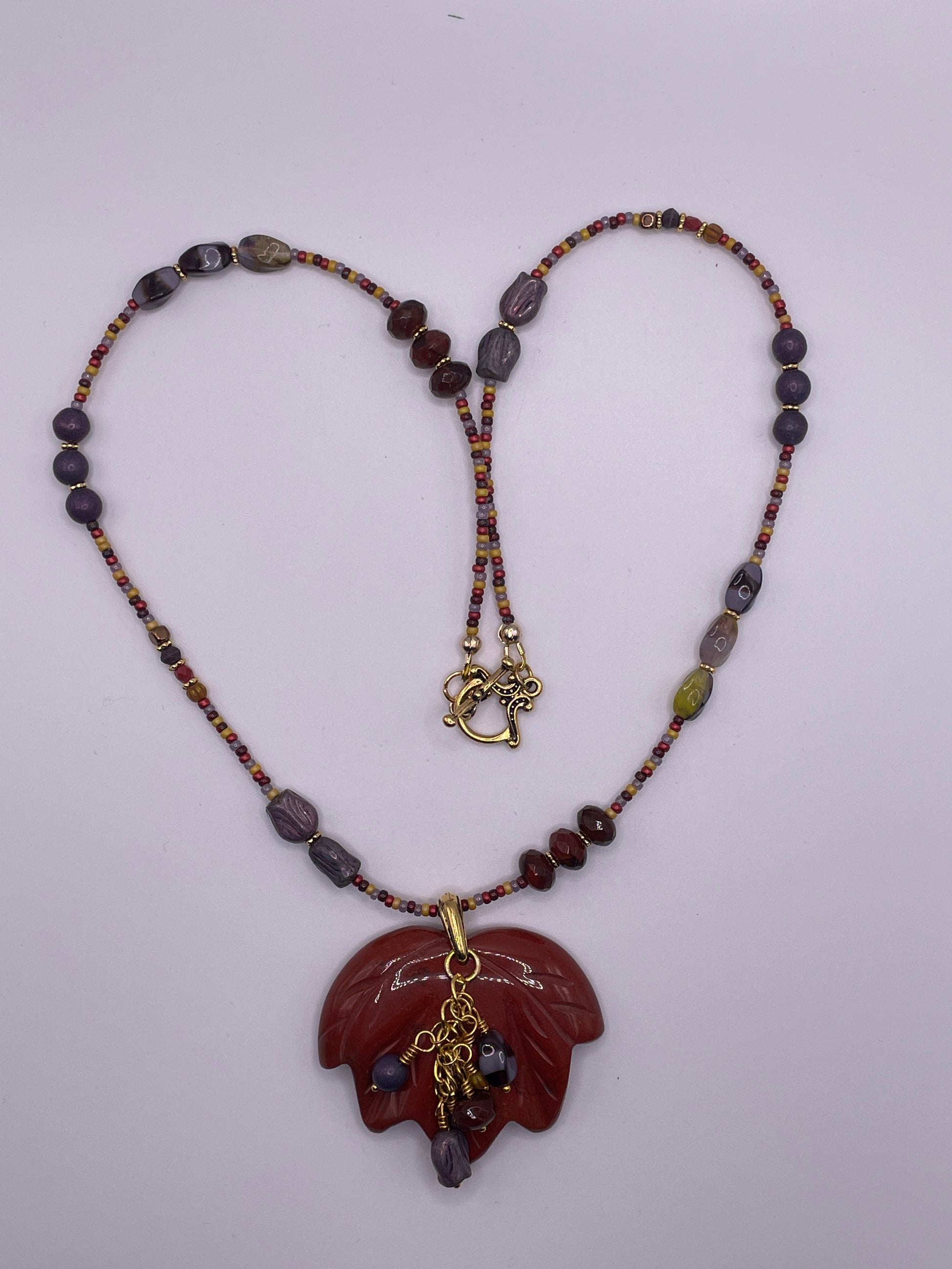 a meticulously hand carved Red Jasper Maple leaf adorns this necklace with purple Mookaite twist barrels,