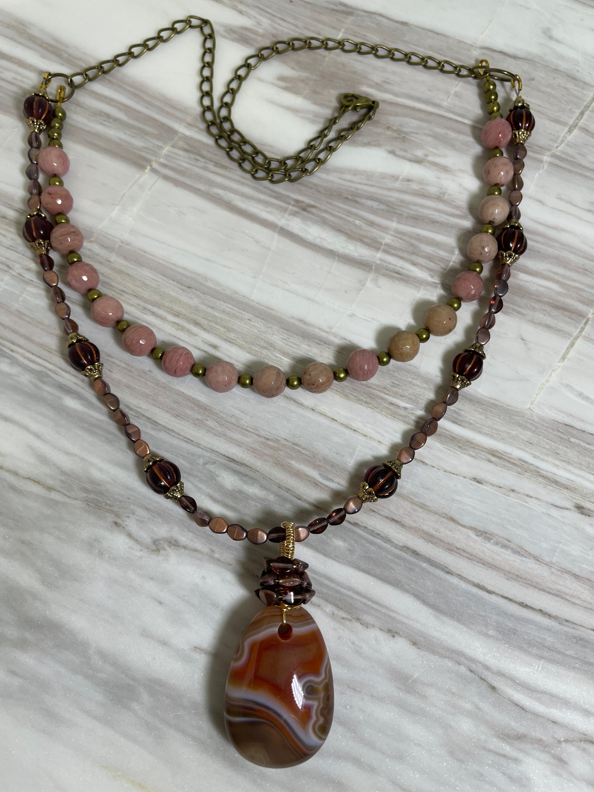 Heat Dyed freeform carnelian pendant which hangs from a handmade wire wrapped bail. The two strands are made up of 4 x 5mm Czech glass pinch beads, 8mm pink rhodonite faceted rounds, czech glass garnet/lavender 8mm copper washed melons, 4mm brass finished spacer beads with a antique brass 5mm x 4mm chain. Measures 38cm