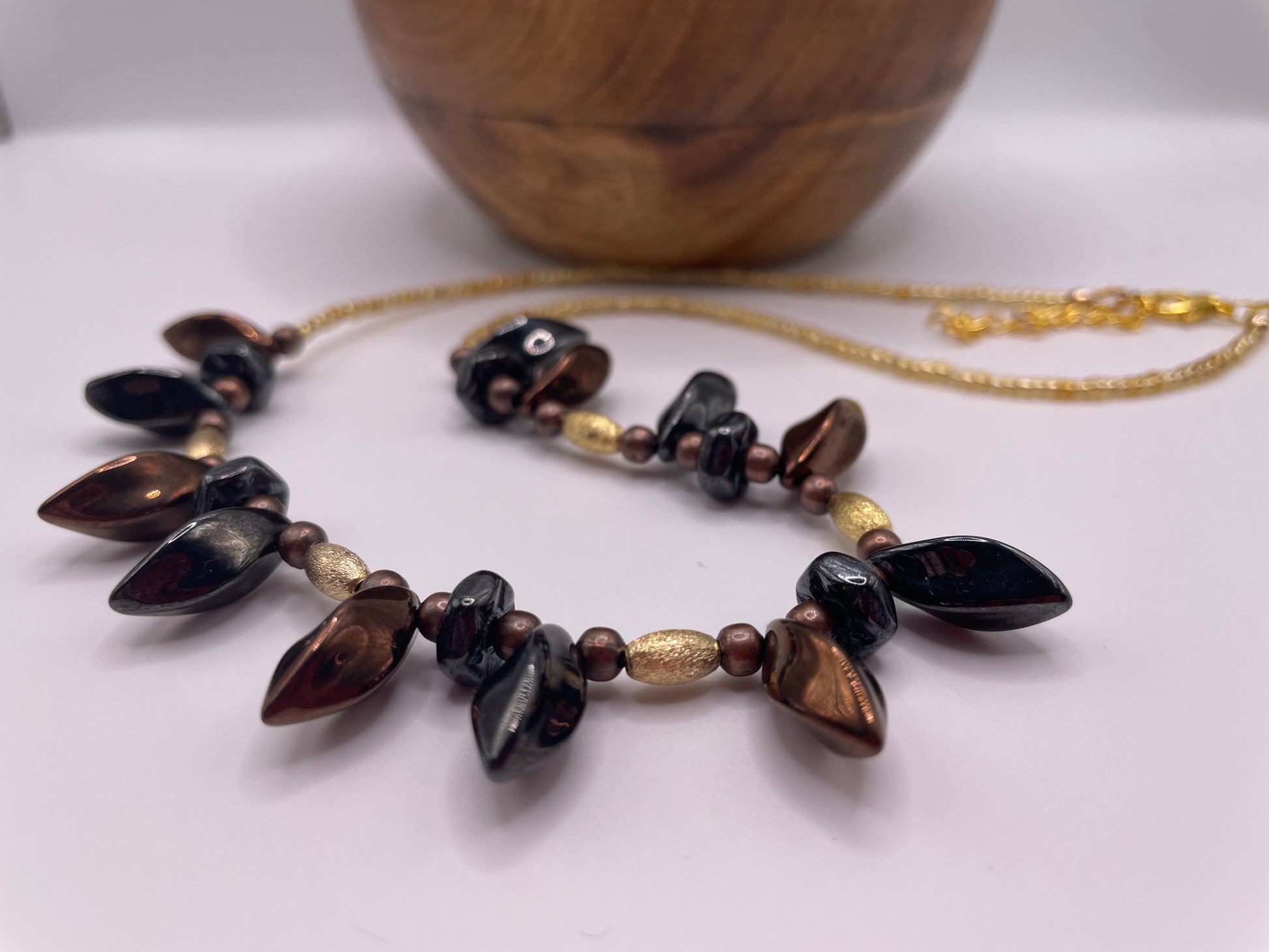 | Introducing our exquisite "Necklace with a Twist" - an exotic piece featuring stunning bronze and hematite brio twist beads with elegant gold accent spacer barrels beads and hematite hex rondelles. Elevate your style with this unique and captivating jewelry masterpiece. Measures 45cm + 5cm extension |
