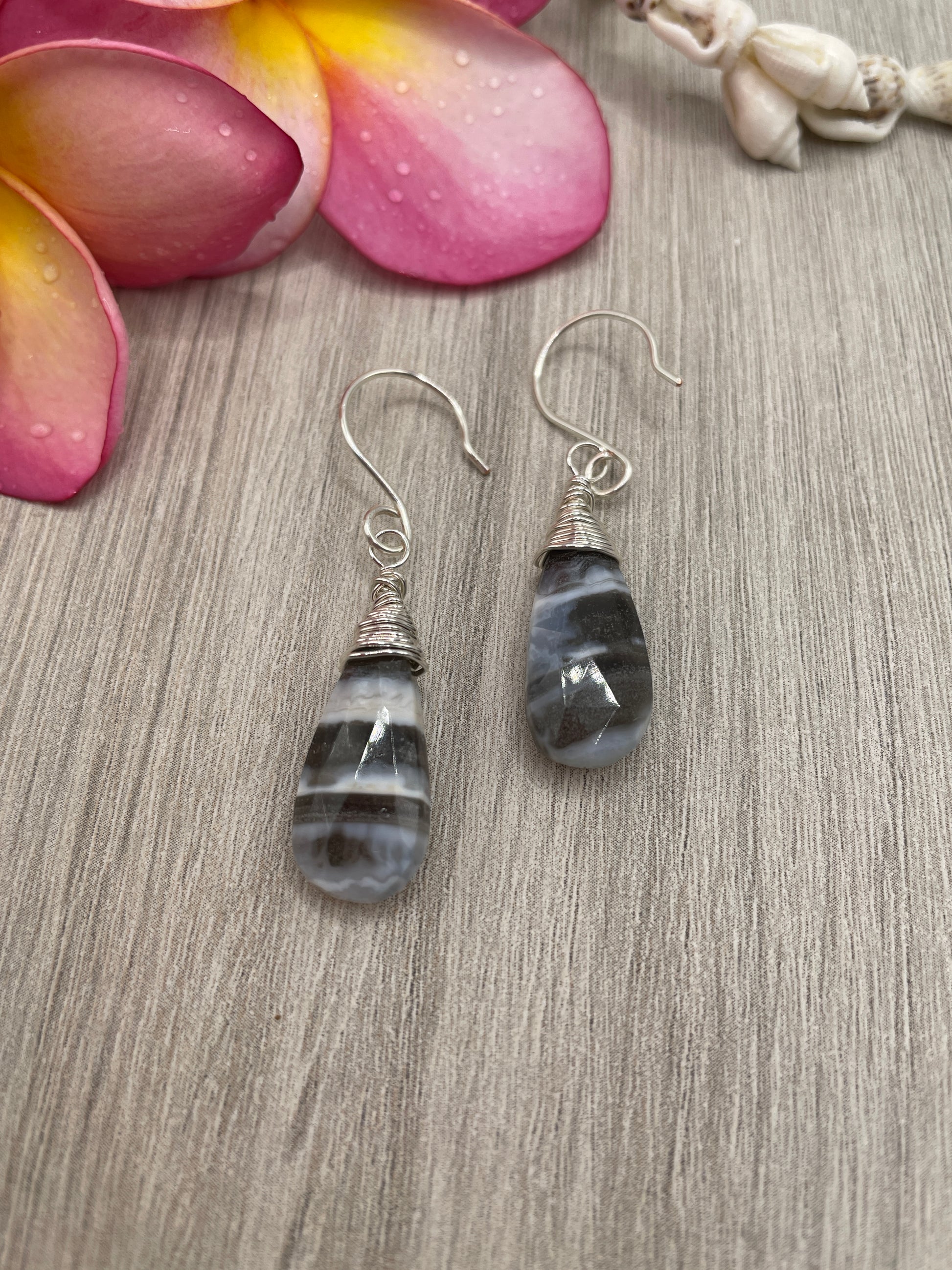 Indian-cut, Blue Boulder Opal, Faceted Long Pear Brio with Handcrafted Ear Wires