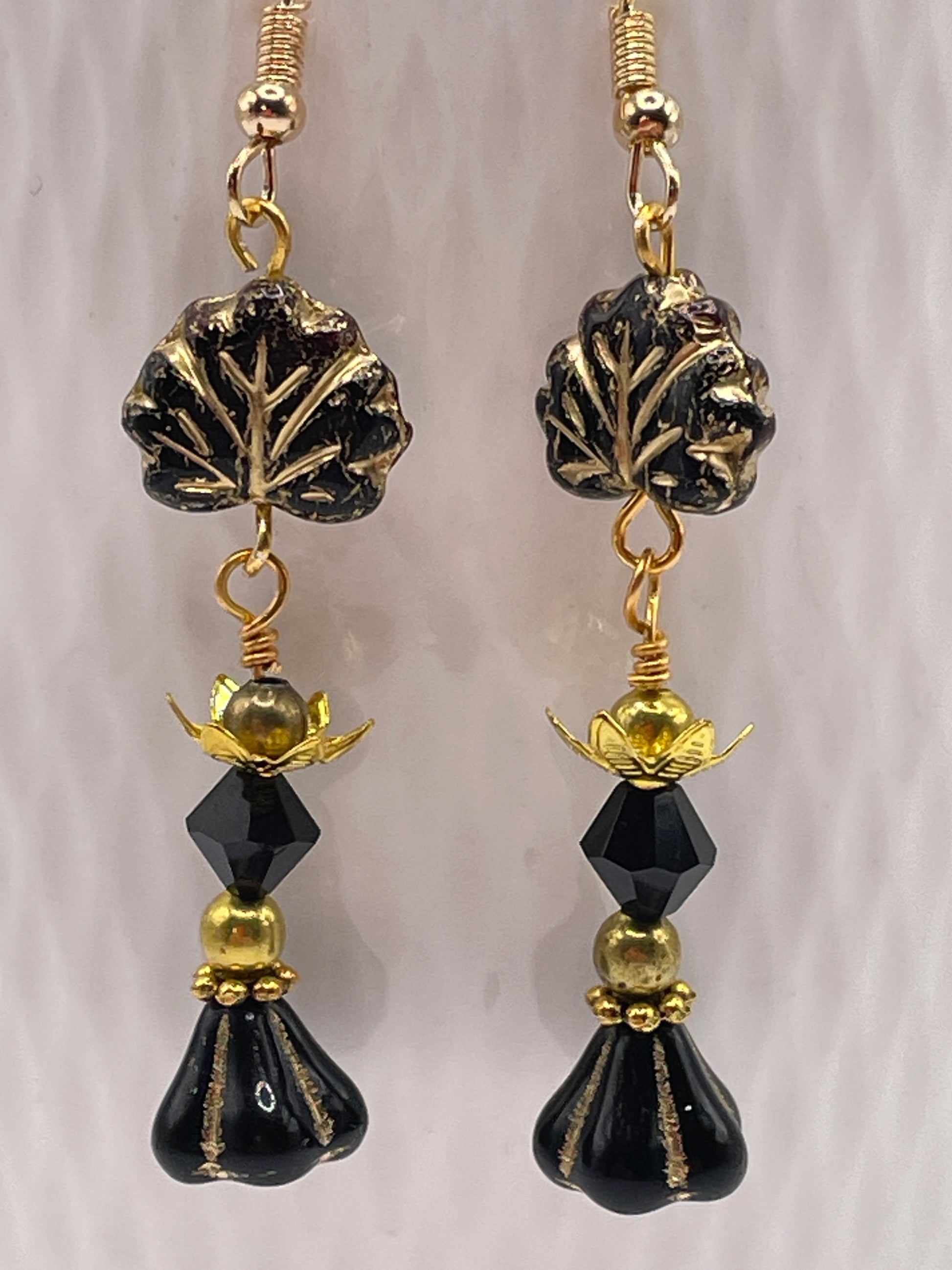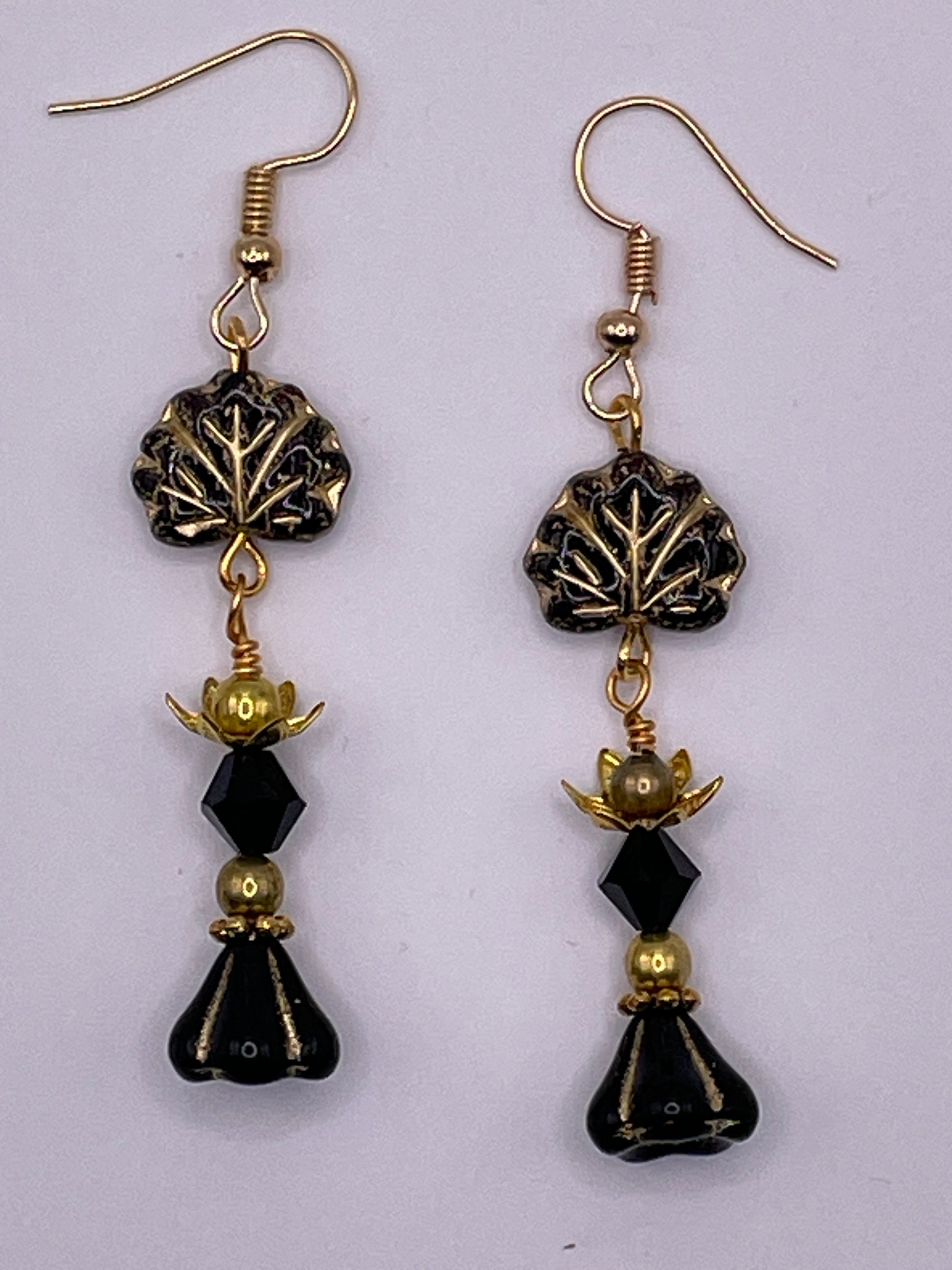 Jet Black and Gold Art Deco Look earrings 6cm (2-1/4") 10.5x13mm Jet Black and gold Czech glass maple leaf, 8mm bicone, 8.5x9.5mm Czech glass jet black bell flower with gold plated bead caps, spacer beads and ear wires.