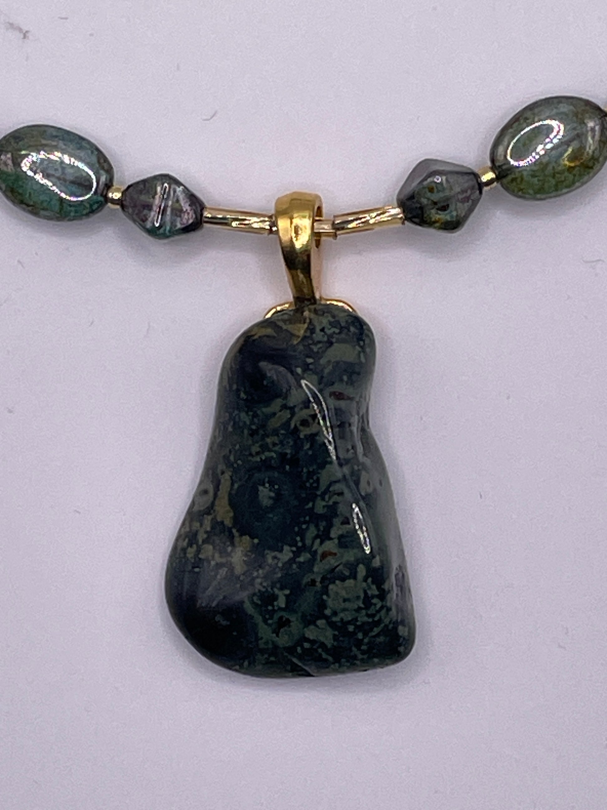 Kambaba Jasper Pendant 53cm (21") Stone measures 35x22x10mm. The beaded strand is made up from Czech glass Picasso lustre ovals and bicones with gold lined twisted tube beads, finished off with a gold plated lobster clasp. Earrings measure 4.5cm