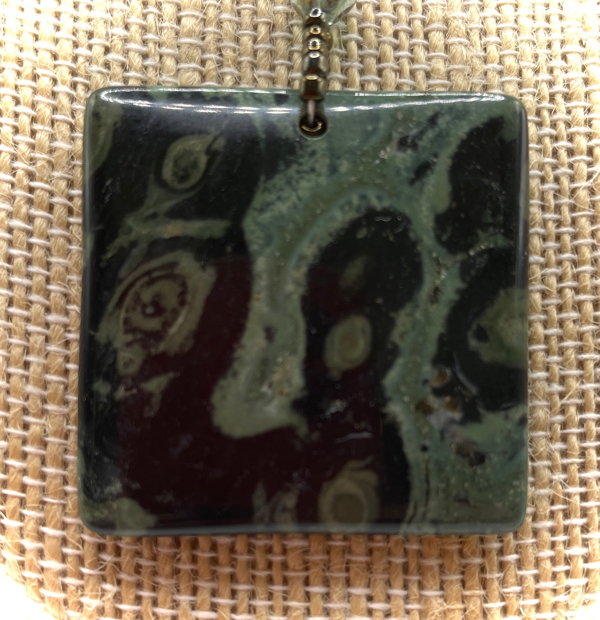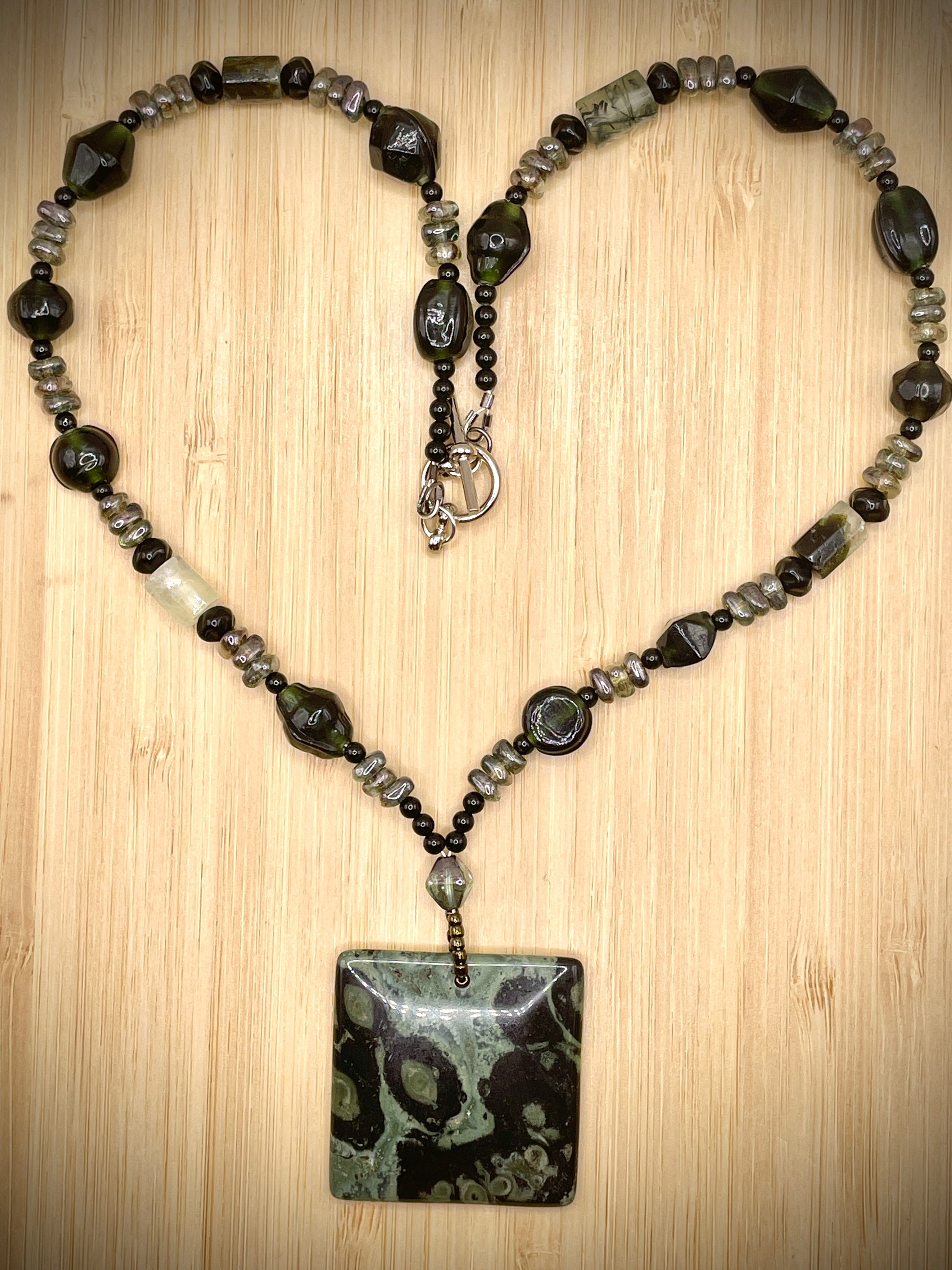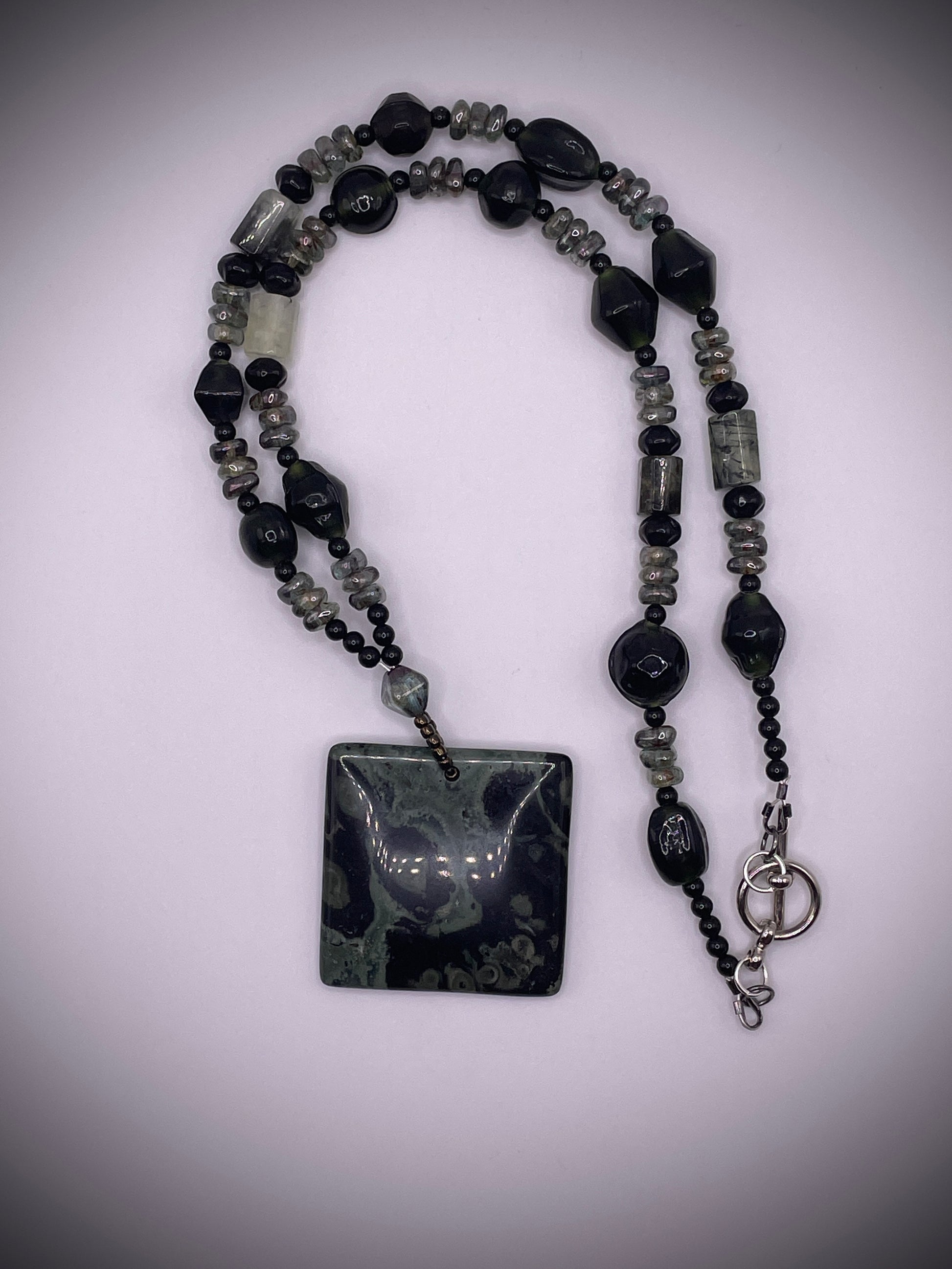 Introducing our exquisite Kambaba Jasper Square Pendant Beaded Necklace, a harmonious blend of elegance and nature. Crafted with black and green beads, glass, seed bead chain, and a silver-plated toggle clasp, this stunning jewelry piece brings a touch of refinement to any ensemble. Measures 47cm.