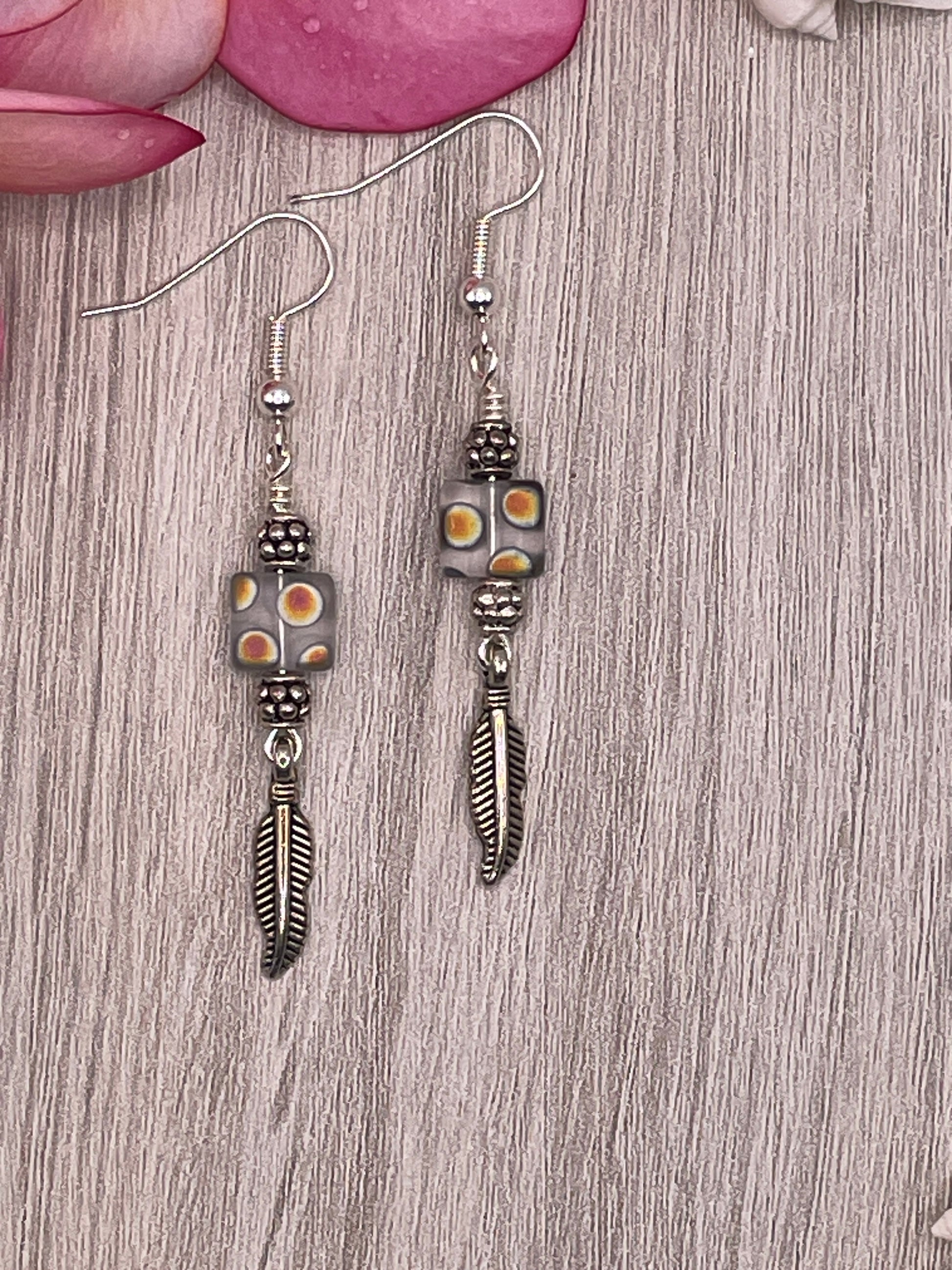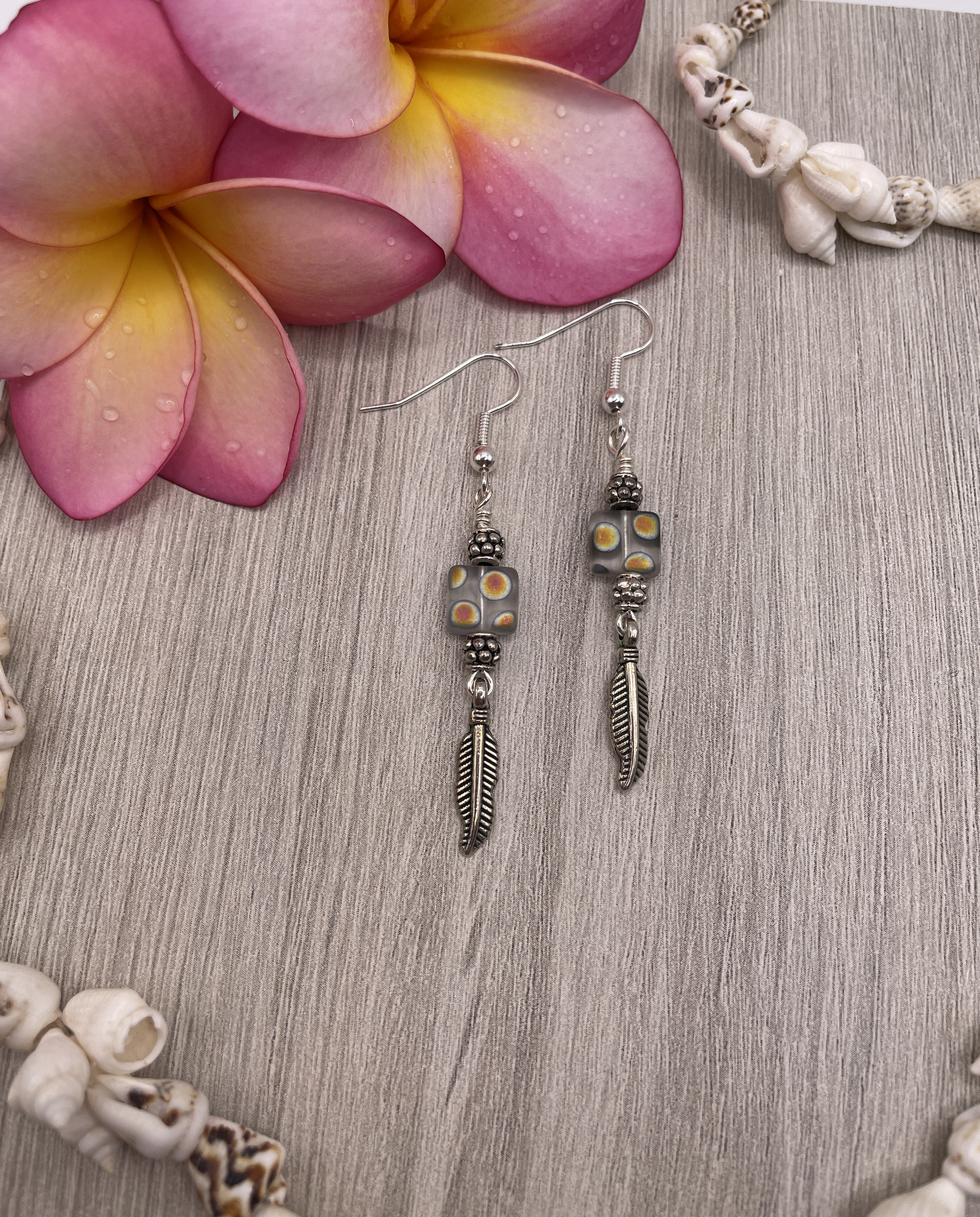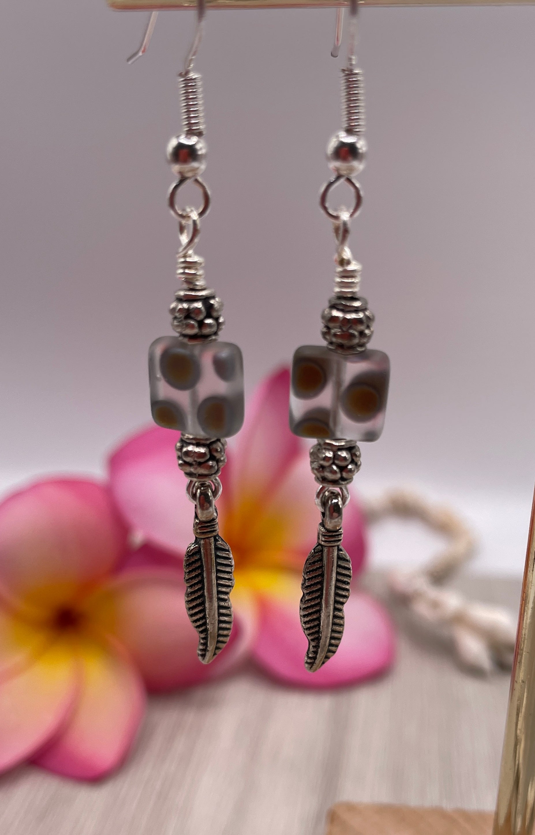Add a touch of elegance to your style with these Laser Etched, Square, Polka Dot, Matte Gray Crystal Marea earrings. These stylish earrings are made of high-quality glass material and are handmade by skilled artisans in Australia. The earrings feature a unique laser-treated square crystal with a matte grey finish and polka dot design, adding a touch of sophistication to your look. The earrings are 5cm in length and have a French wire closure for easy wear. The stunning feather detail adds a touch of nature to the design. There is no seller warranty for this item, but the quality of the product is guaranteed. Perfect for any occasion, these dangle/drop earrings are sure to impress.