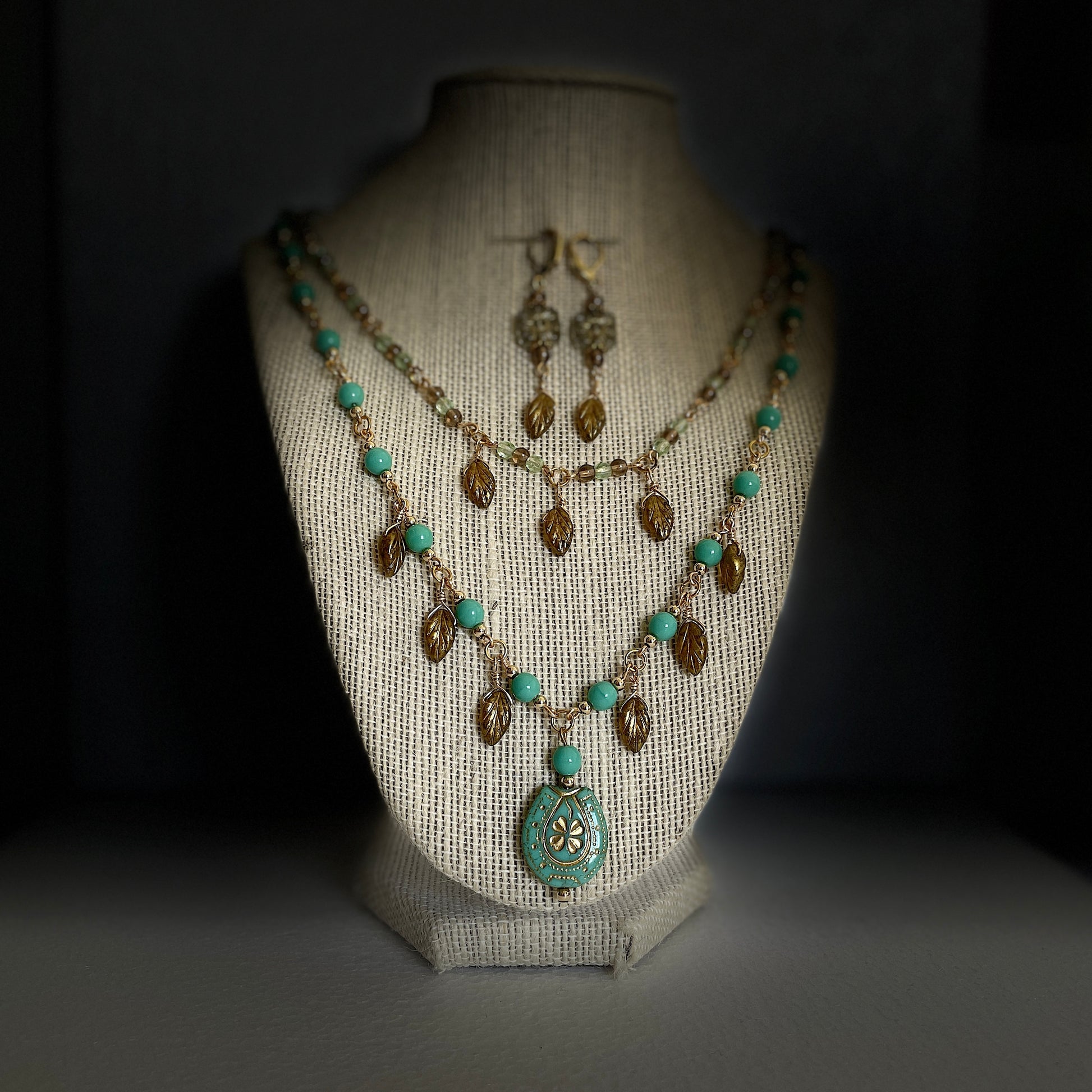 Featuring a 18 x 20mm Czech Glass Lucky Horseshoe focal is made up with 2 beaded strands. The bottom strand has 6mm Czech glass Druk rounds in Opaque Turquoise with Czech glass rustic gold Elm Leaves the top strand has 3 of the same leaves and 4mm faceted fire polish peridot Czech glass alternated with 4mm Smoky Topaz Druk bead. Joined with 11mm Czech glass crystal/gold flower beads. 61cm in length (Opera)