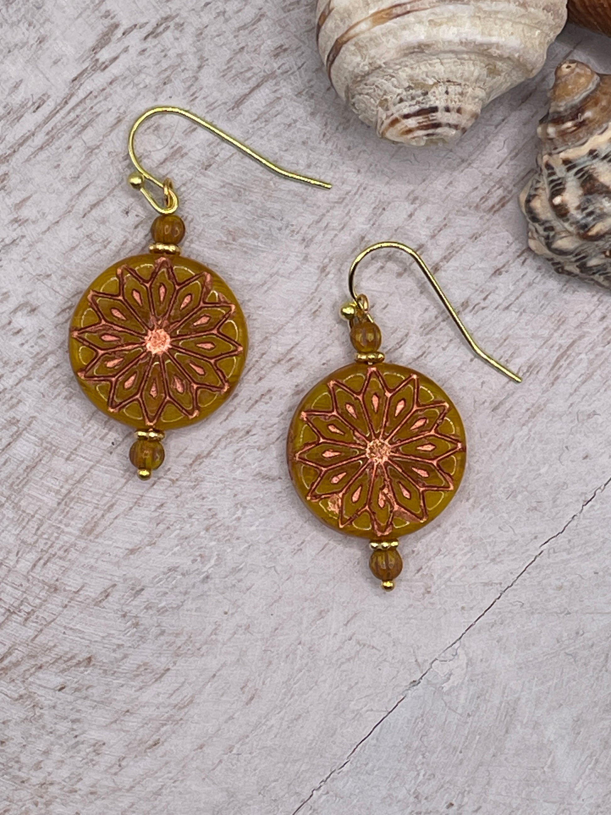 Mandala Flower, Czech Glass, Yellow Opal Mix Copper