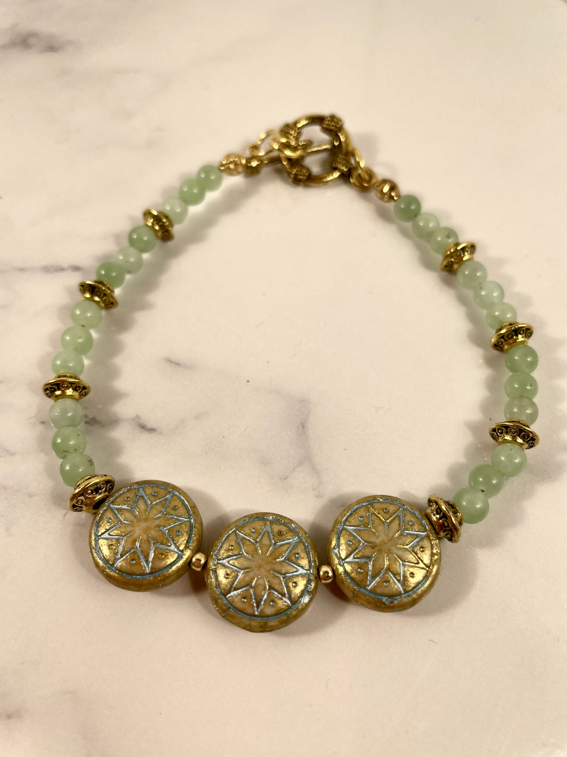 Measures 21cm (8.5") Beautiful gold washed blue/green 14mm star beads on a strand of 4mm gemstone beads in the same blue/green with gold metal spacers and finished off with a gold plated toggle clasp.