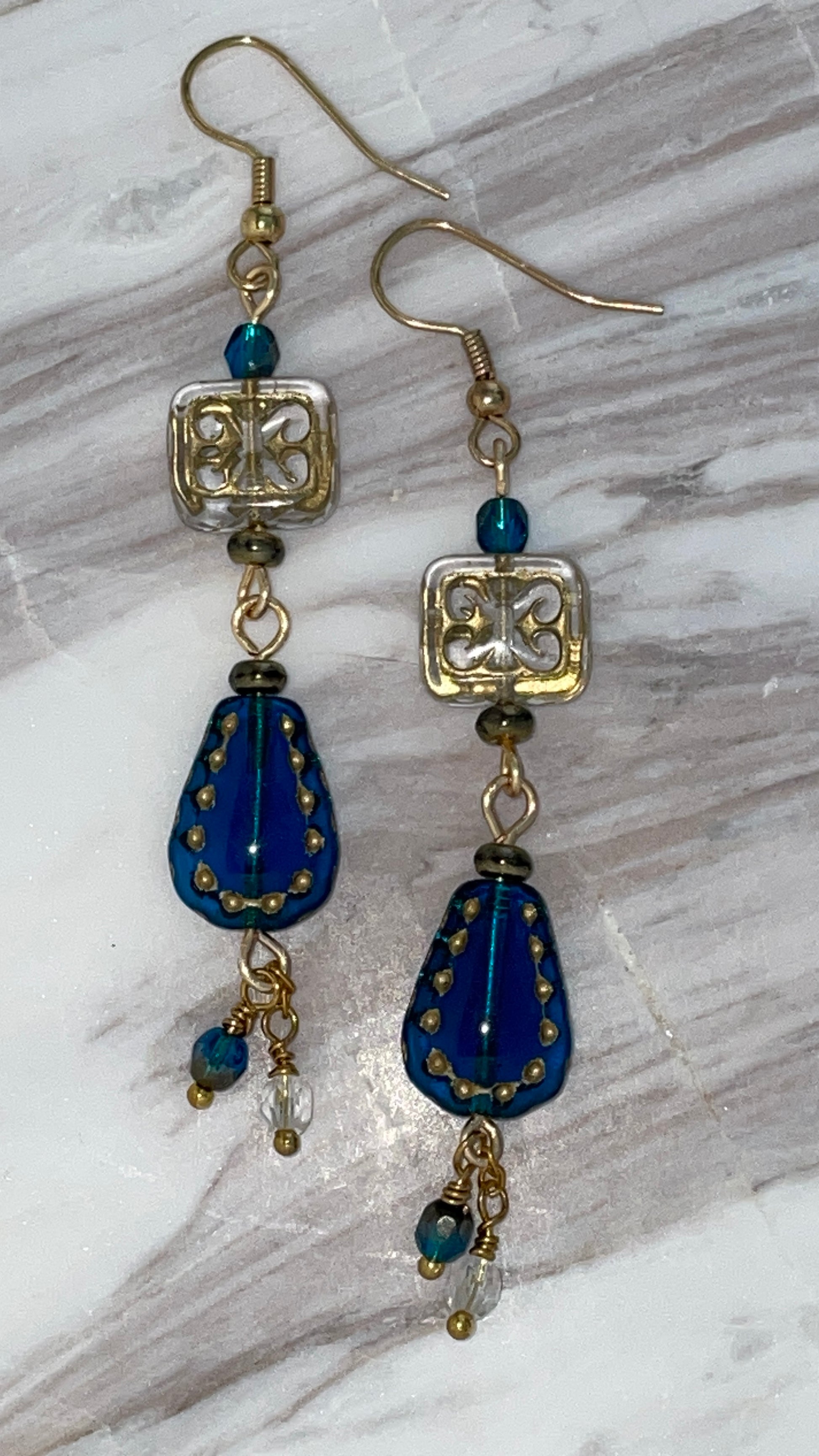 Czech glass Capri Drop earrings topped with a Crystal/Gold rectangle finished off with a gold plated ear wire 5cm in length