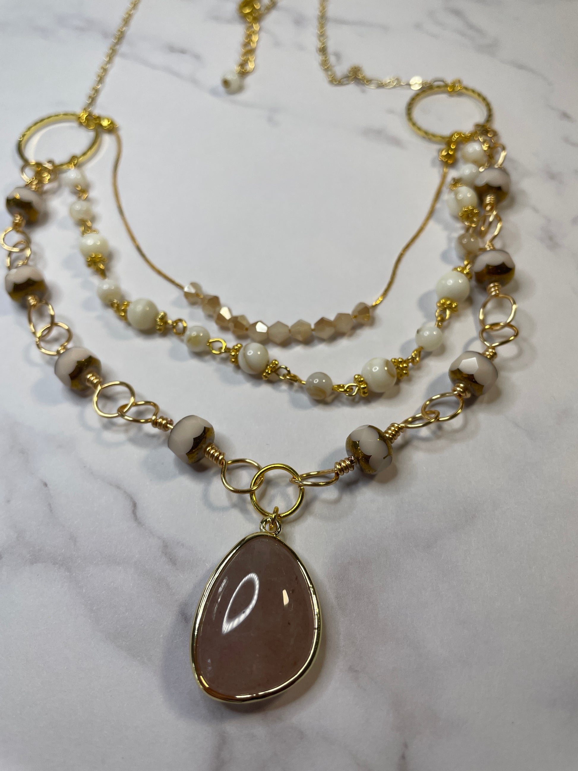 Indulge in the luxurious beauty of our Peach Blossom Multi-Strand Necklace. Adorned with a 27mm Strawberry Quartz & Brass Pendant and wire wrapped 7.5x6mm Glass Rondelle Beads in Apricot, this necklace exudes elegance. The 6x14mm Freshwater Shell Links add a touch of sophistication, while the 0.6x0.9mm Brass Coreana Chain and crystal bicone details in Ivory Champagne complete the look. With a tarnish resistant chain and lobster claw clasp, this necklace is both stylish and practical. Elevate any outfit with this exclusive piece.