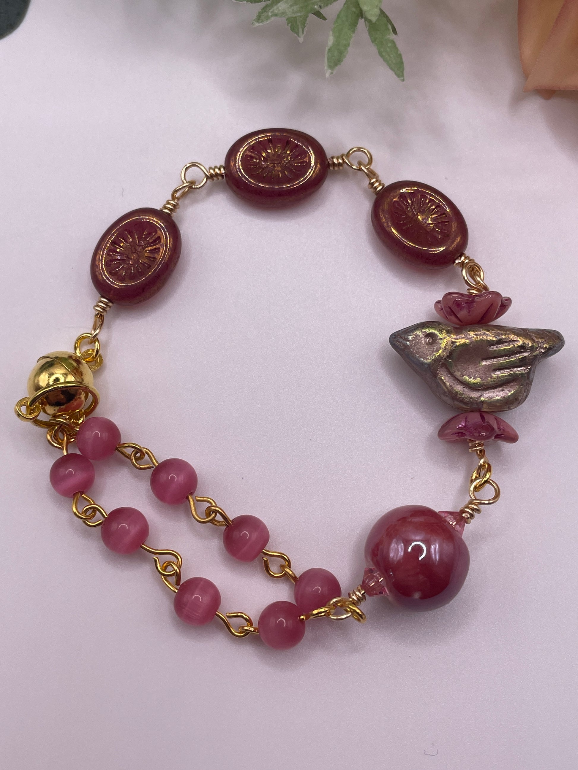 Expertly crafted, this Pink Orchard Bracelet features a stunning Czech Glass Carved Bird focal piece, complemented by Czech Glass Kiwi Ovals and flower caps. The 5mm Pink Cats eye beads add a touch of elegance, while the 12mm Porcelain Dark Orchard bead adds a unique element. Complete with a magnetic clasp for easy closure, this bracelet is a must-have for any accessory collection.