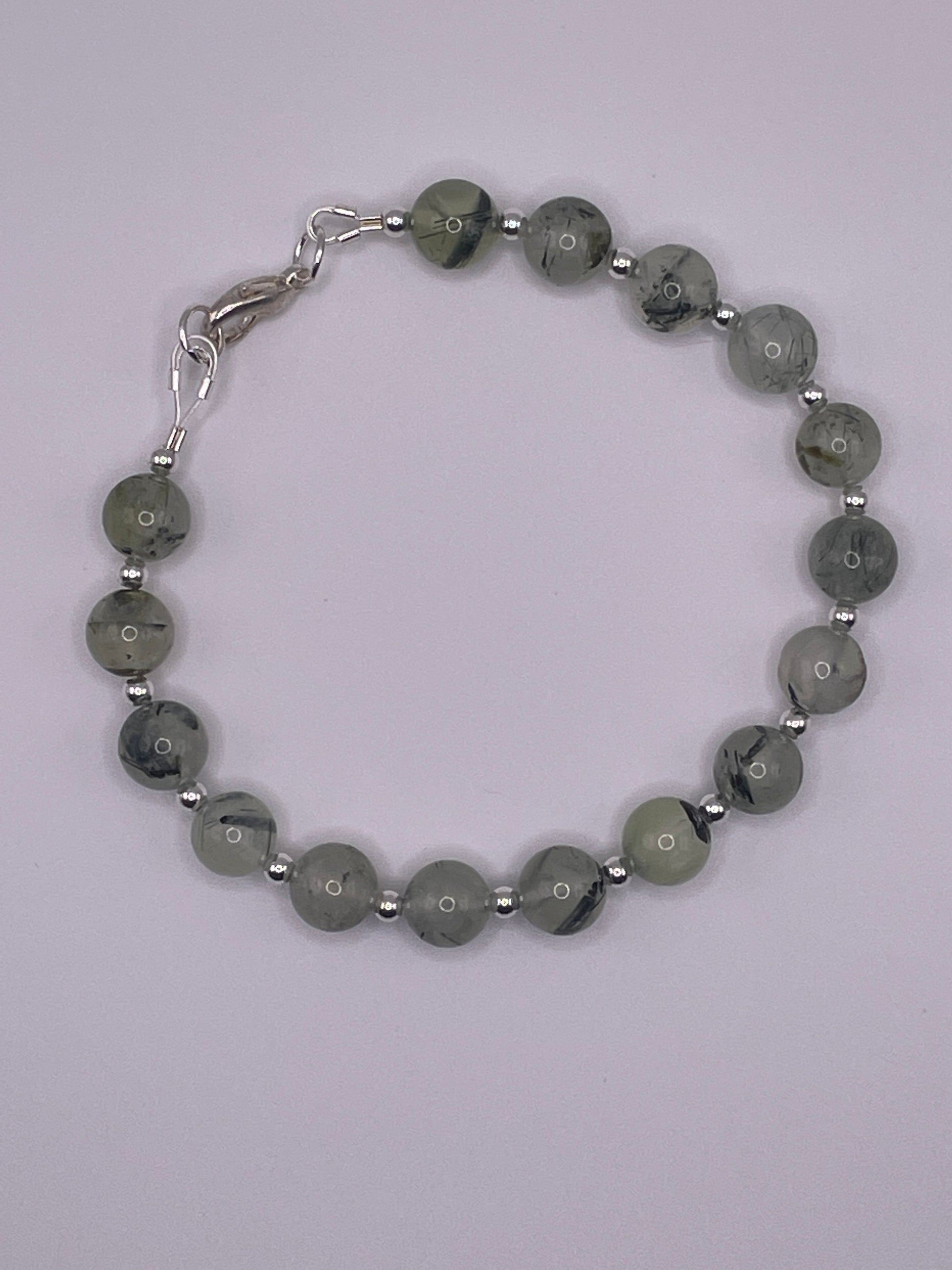 Measures 20cm (8") 8mm Prehnite rounds with 3mm silver plated metal spacer beads with a lobster clasp. Prehnite is considered a stone of unconditional love and the crystal to heal the healer.