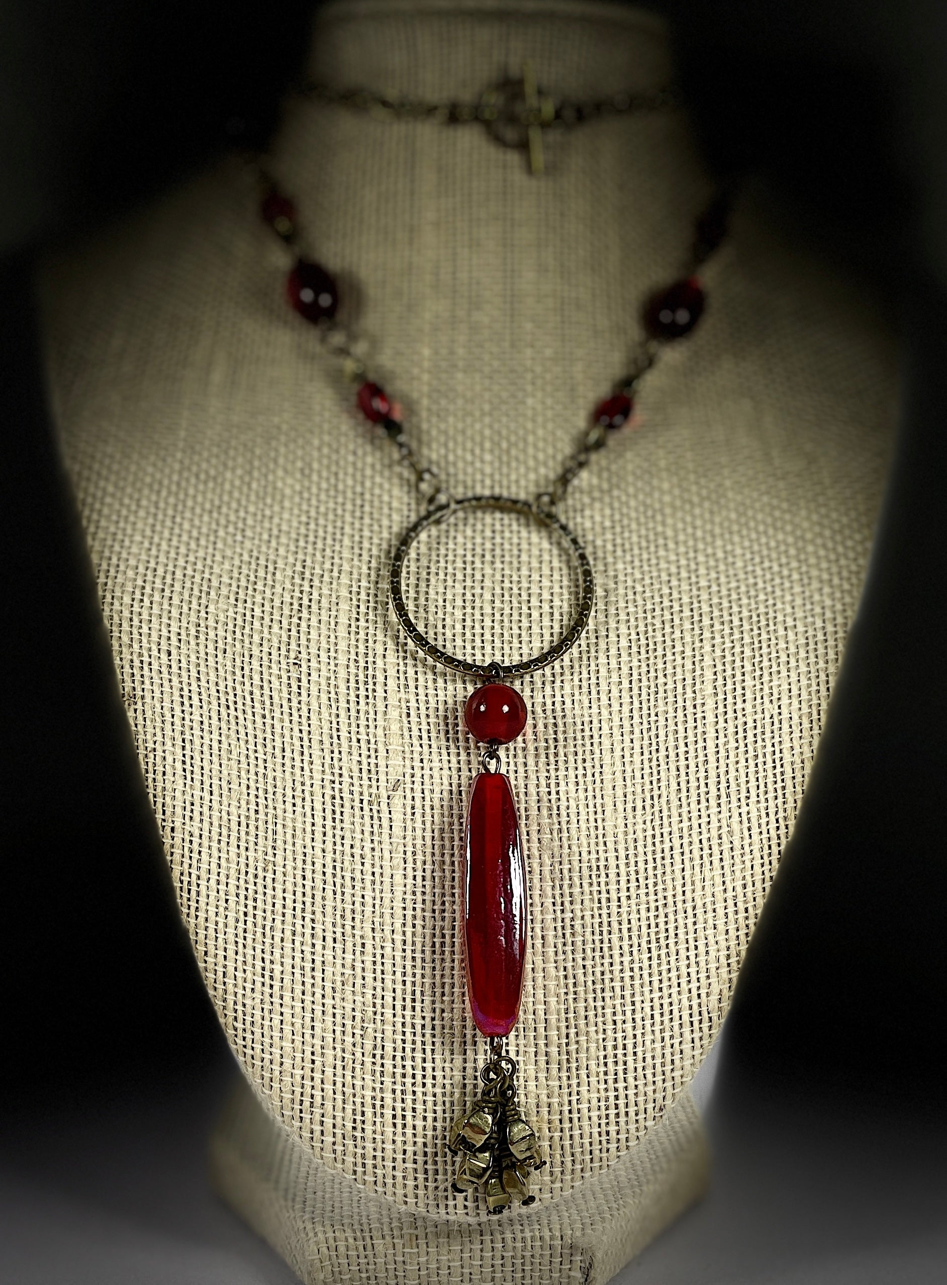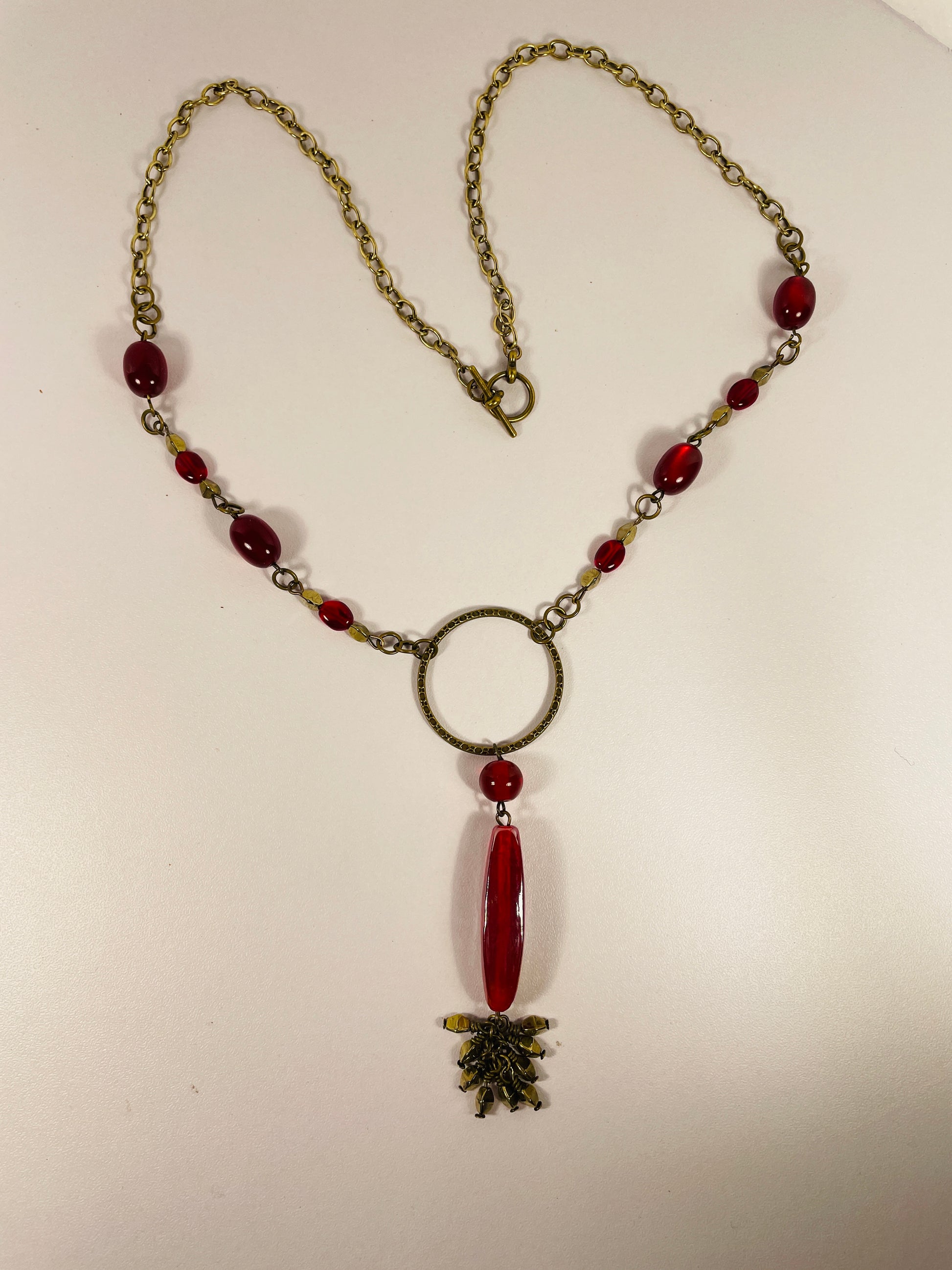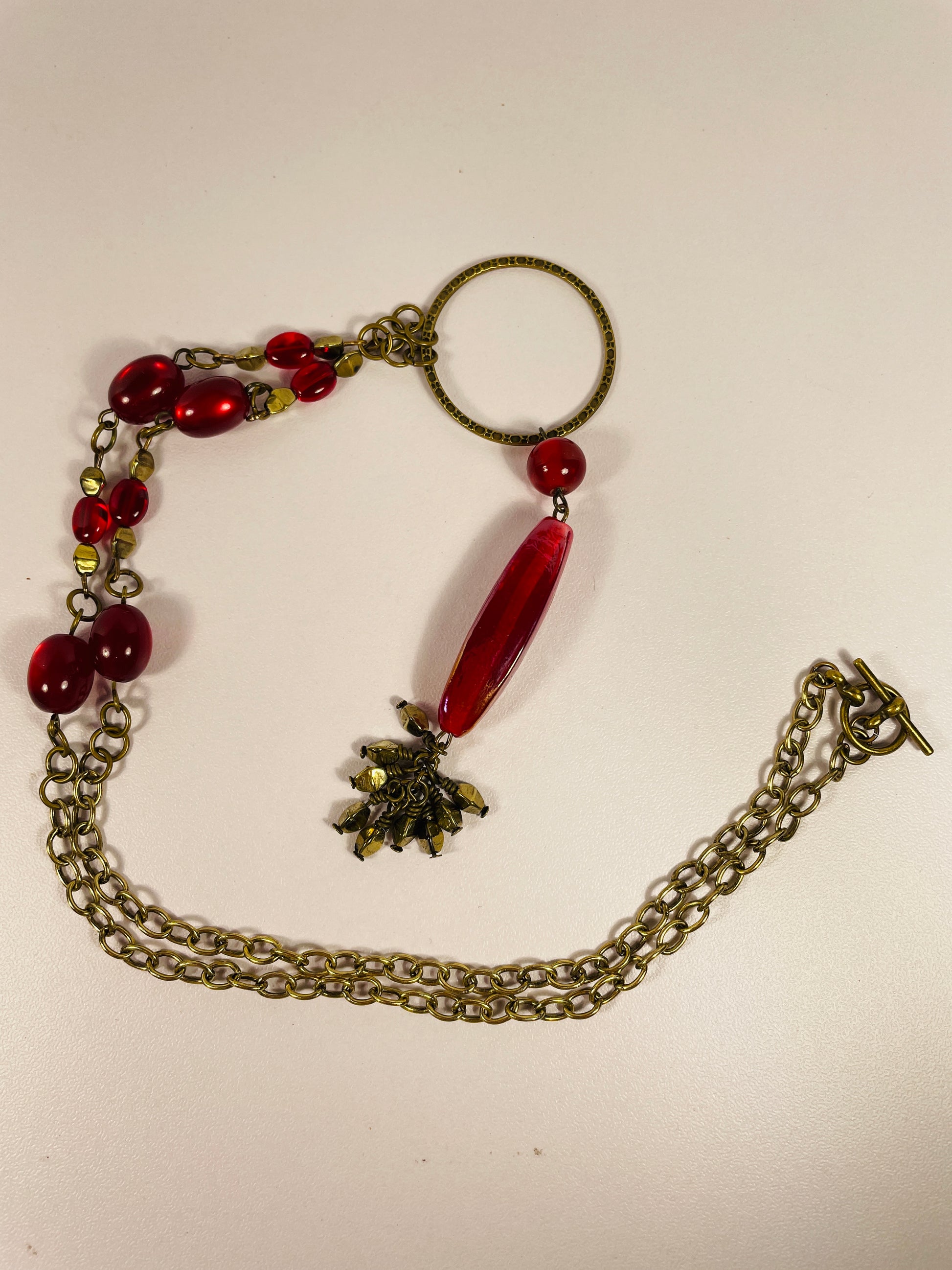 Measures 64cm (25") Red glass focal 3.5x10mm with an antique gold pinch beaded tassel hang from a 35mm diam. antique gold ring, with an antique gold chain decorated with 12 and 8mm red glass oval beads with a toggle clasp.