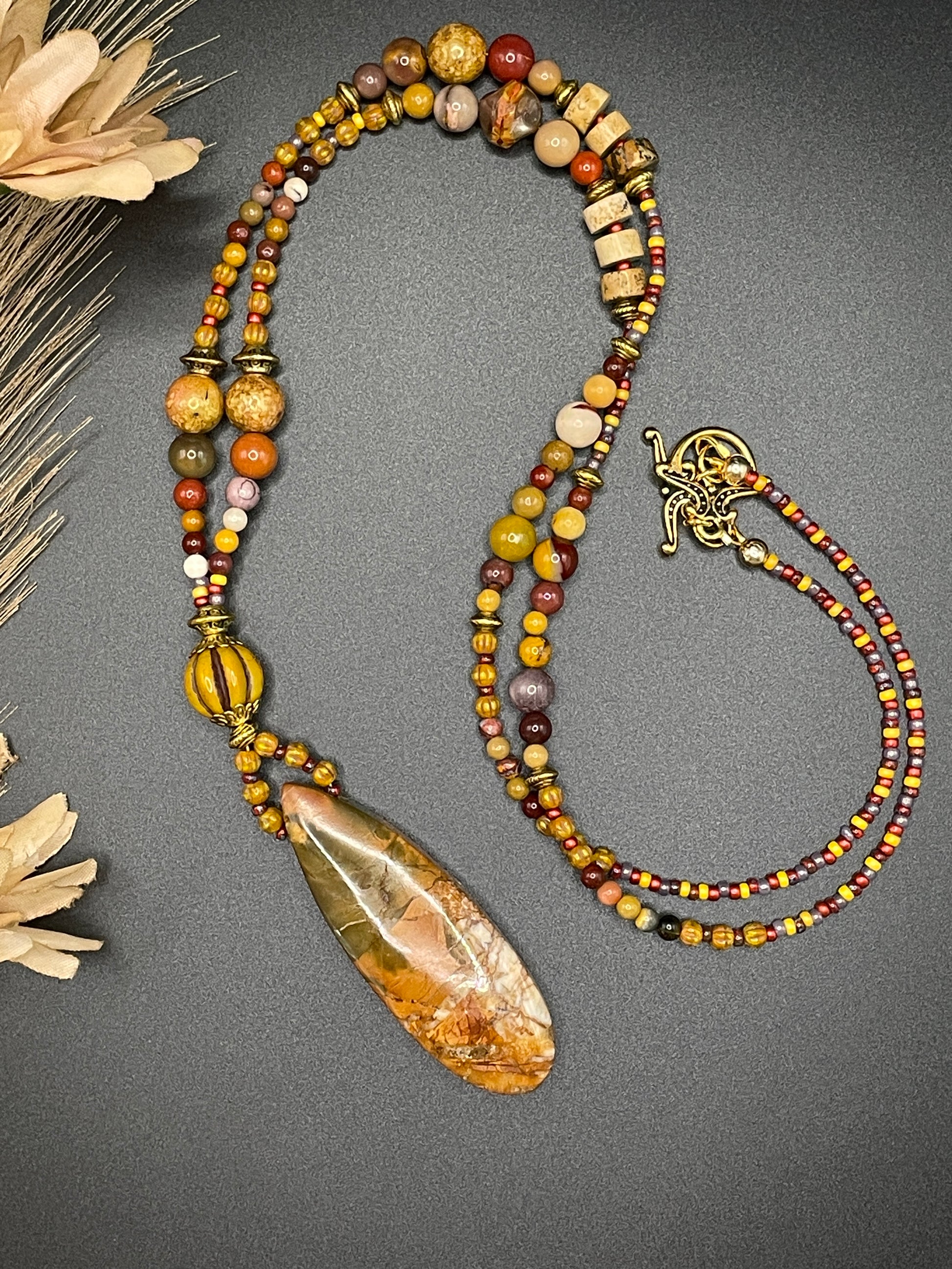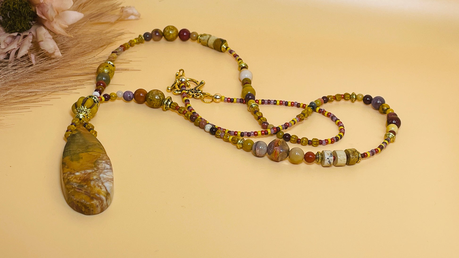 Experience the natural beauty and energy of Red Creek Jasper with our stunning pendant. Measuring 5.5x2cm, it's strung on a 73cm beaded necklace featuring elegant Czech Glass Melon beads, Tibetan spacer beads, and Mookaite and picture jasper heishi accents. Finished with a 22k gold plated toggle, this is a true statement piece. Elevate your style and enhance your energy with the Red Creek Jasper Pendant!
