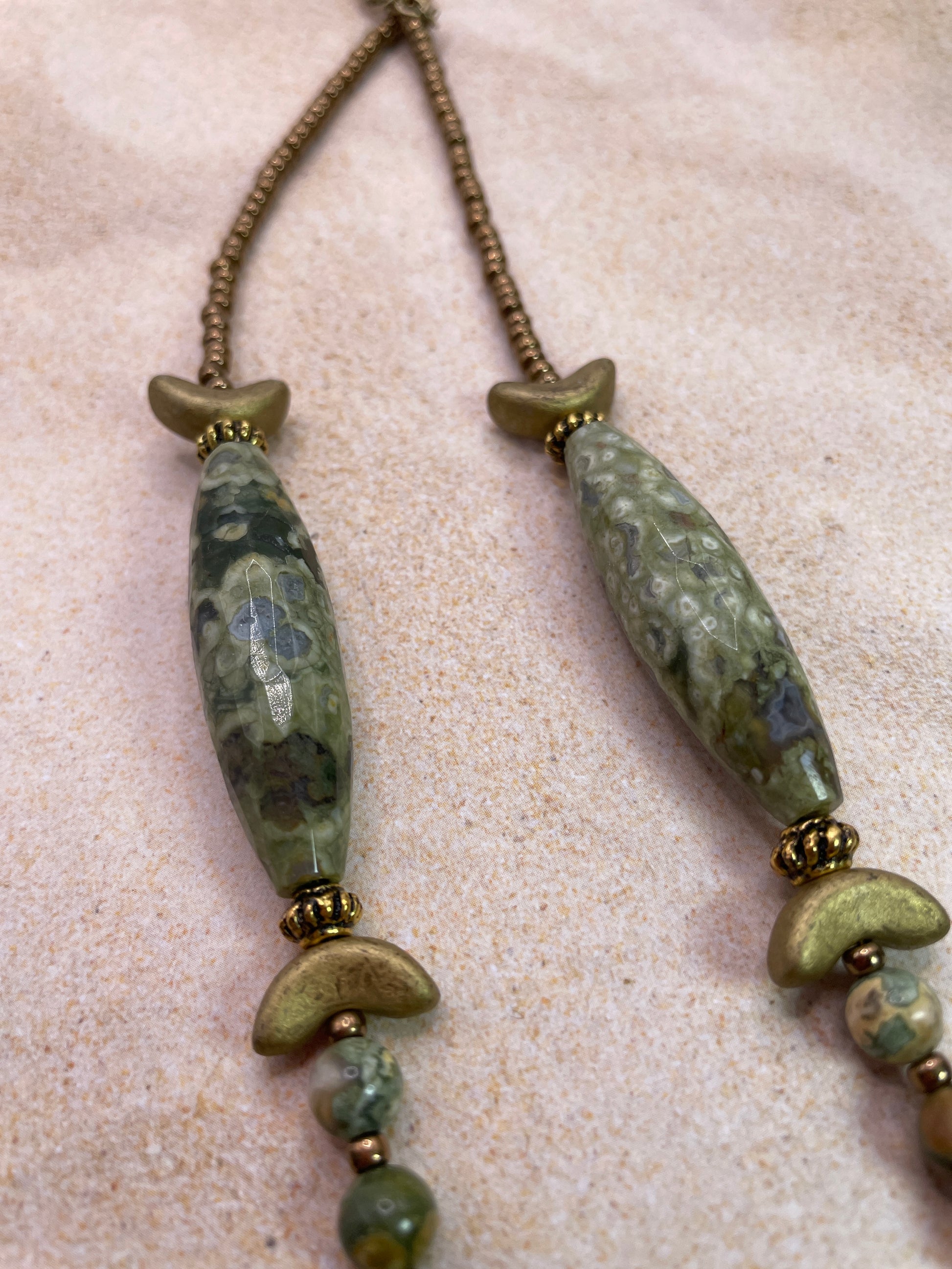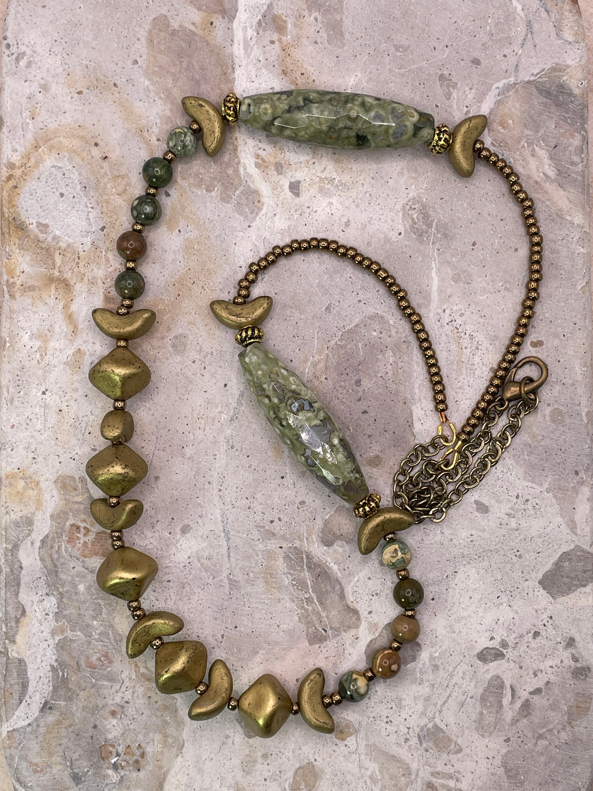 Unleash your inner strength with our Rhyolite Barrel Necklace! Measuring 64cm in length, this stunning piece features two 12x41mm Rhyolite Faceted Barrels and 6.7mm Rhyolite smooth rounds, accented with Czech Glass stardust gold crescent moon beads and nuggets. Complete with gold plated Tibetan spacers and dark bronze metallic 8/0 seed beads, all on a 22k Antique gold plated chain. Elevate your look and channel your energy with this unique and empowering necklace.
