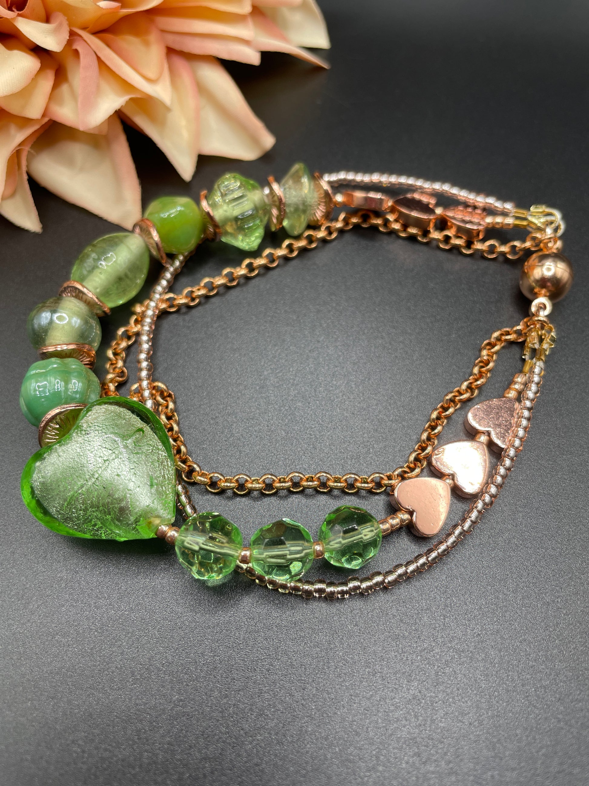 Get ready to fall in love with this Rose Gold & Green Heart Bracelet! Featuring dazzling Rose Gold Hematite hearts and a charming Puffy Foil Heart, this triple-stranded bracelet also includes 8mm Faceted Czech Glass rounds and 9mm Rose Gold plated wavy spacers for a touch of elegance. Keep it secure and stylish with the Rose Gold plated magnetic clasp.