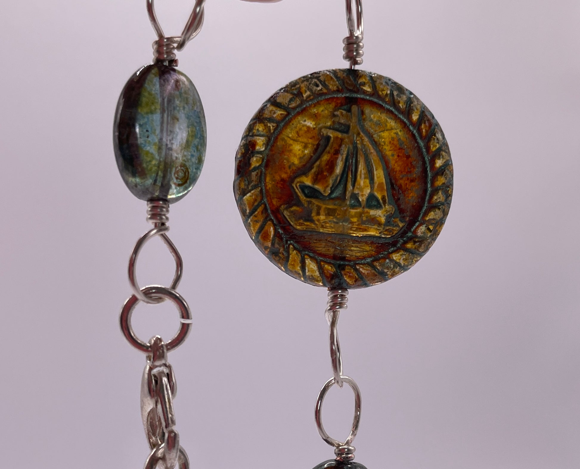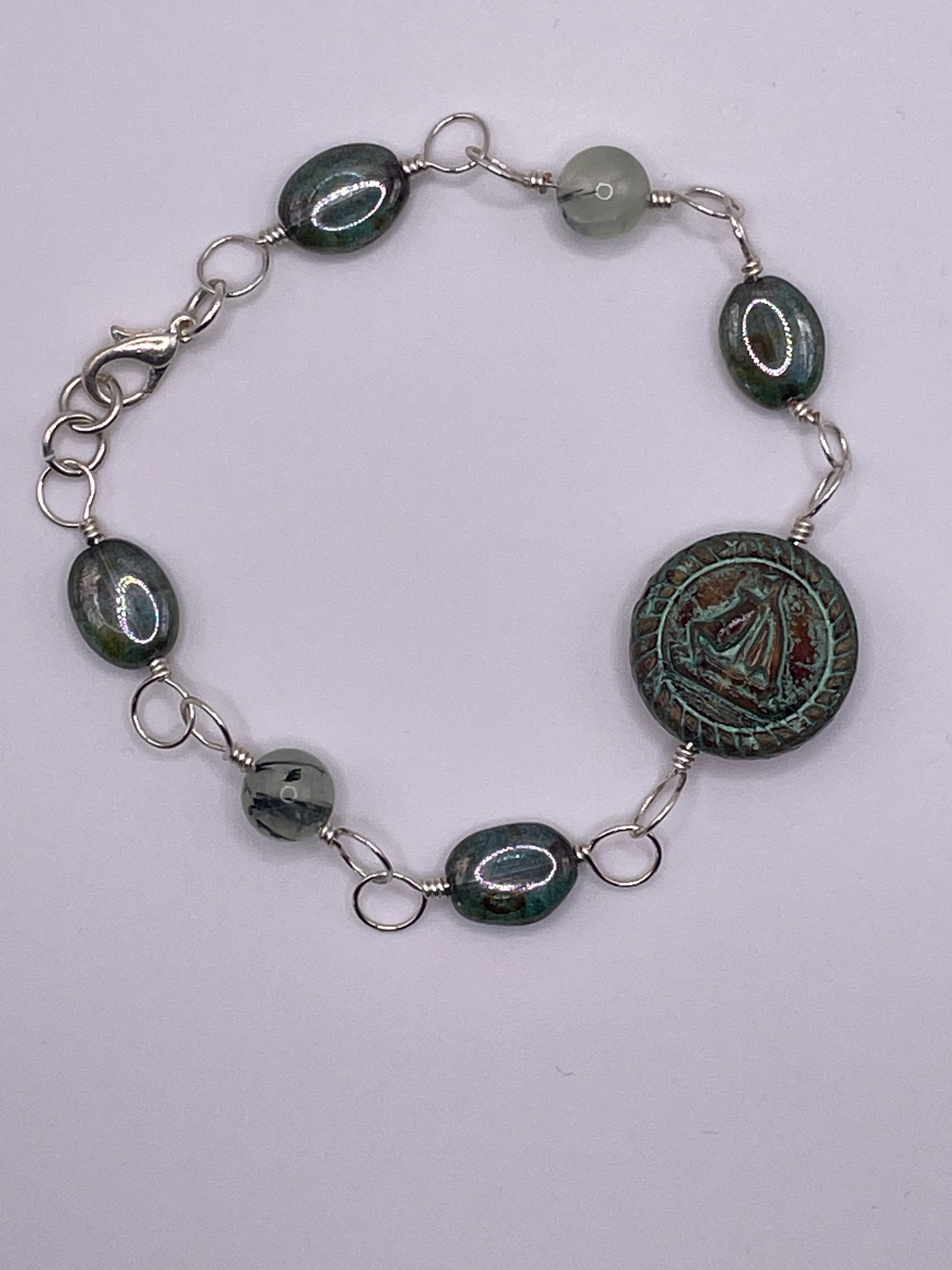 Measures 20cm (8") 19.5mm Czech glass Sailboat medallion in a rustic Picasso mint finish with wire wrapped 8mm Prehnite rounds and 9x11.5mm Czech glass smooth ovals in green Picasso luster with silver plated lobster clasp.