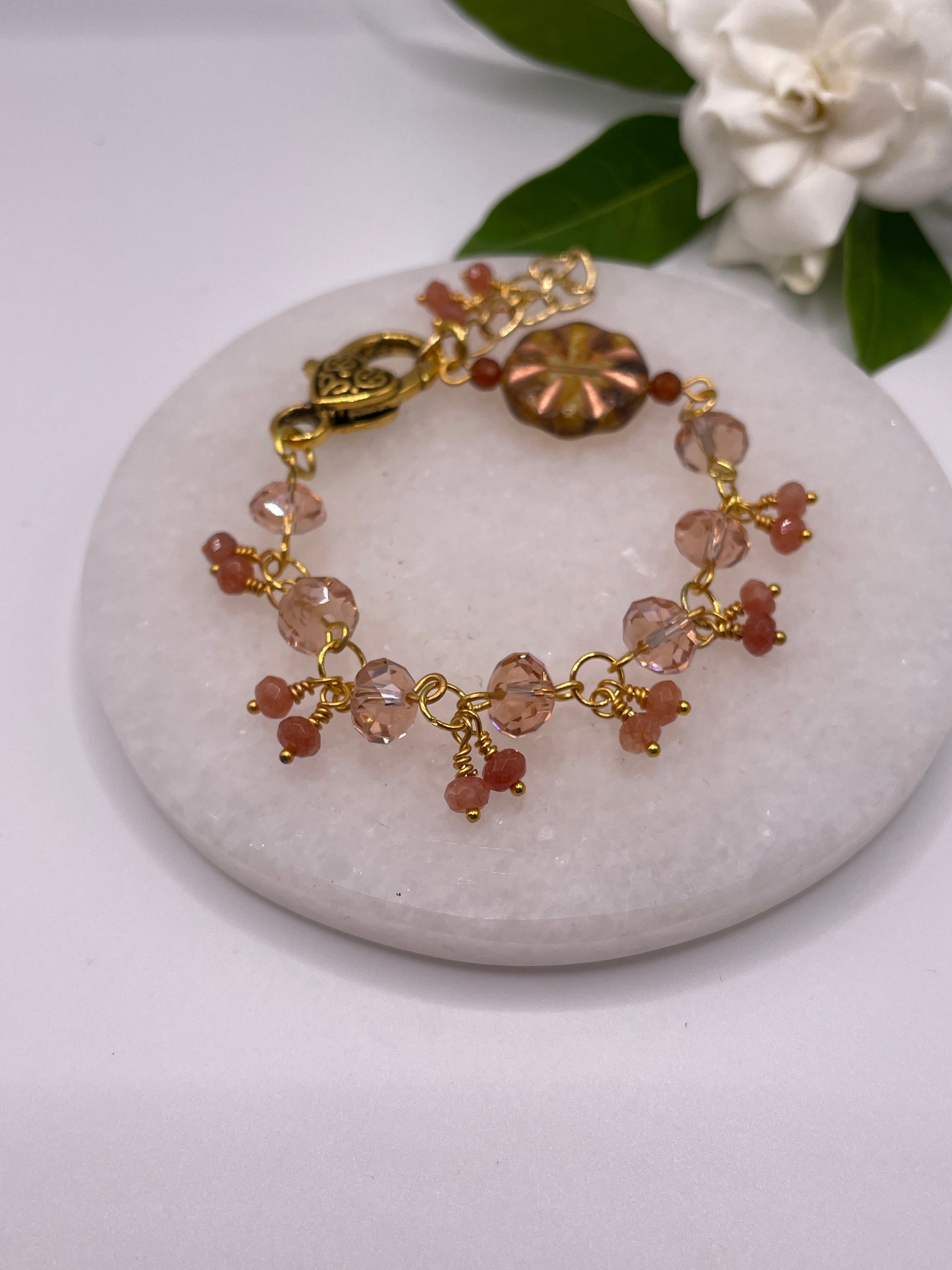 Introducing our exquisite Starburst Coin Bracelet, designed to captivate with its delicate apricot faceted rondelle beads and elegant gold starburst focal. Handcrafted for a touch of sophistication, this stunning piece will effortlessly elevate your jewelry collection. Perfect for any occasion.