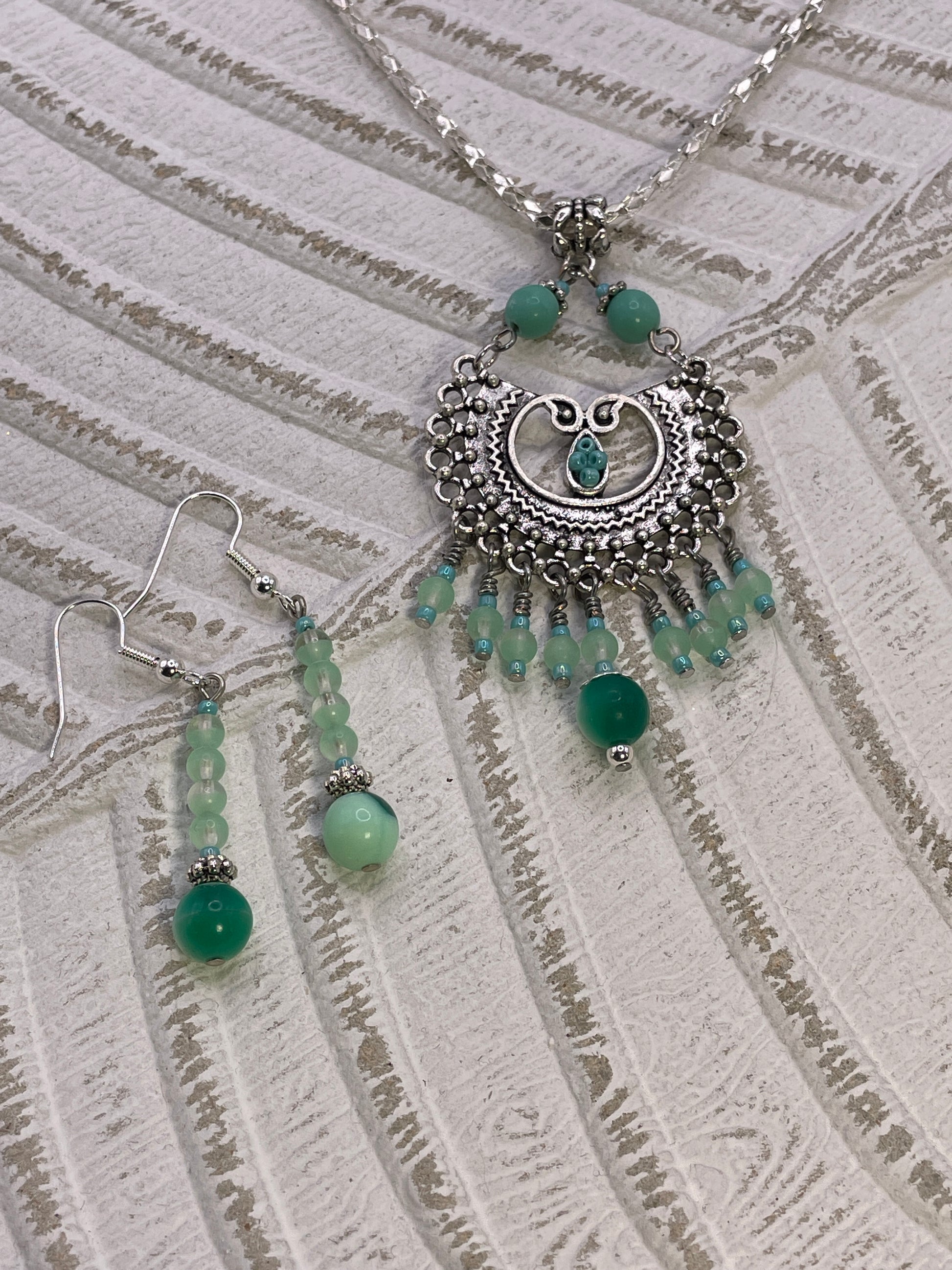 Vintage Boho Necklace and Earrings Featuring a fancy Antique silver plated connector that has 4mm mint/clear Czech glass druk, topped and tailed with an aqua seed bead with an 8mm Mint/Teal Czech glass druk as centre dangle. Two 6mm Aqua colour glass beads add to the silver plated bale, finished with an Antique silver plated Connecta chain and clasp. The same mint coloured beads have been used in the earrings and have silver plated ear wires Necklace measures 46cm, Earrings 4.5cm