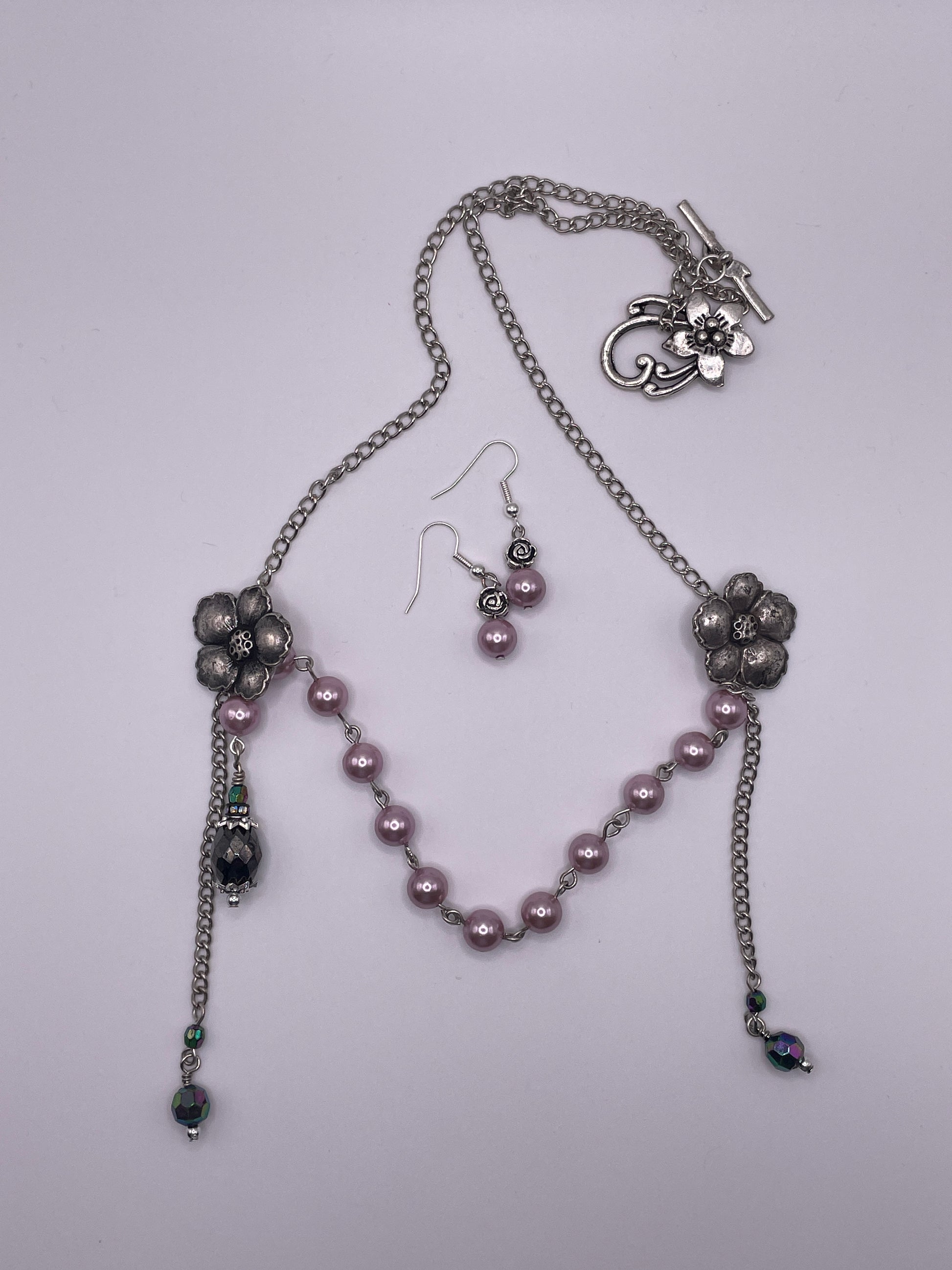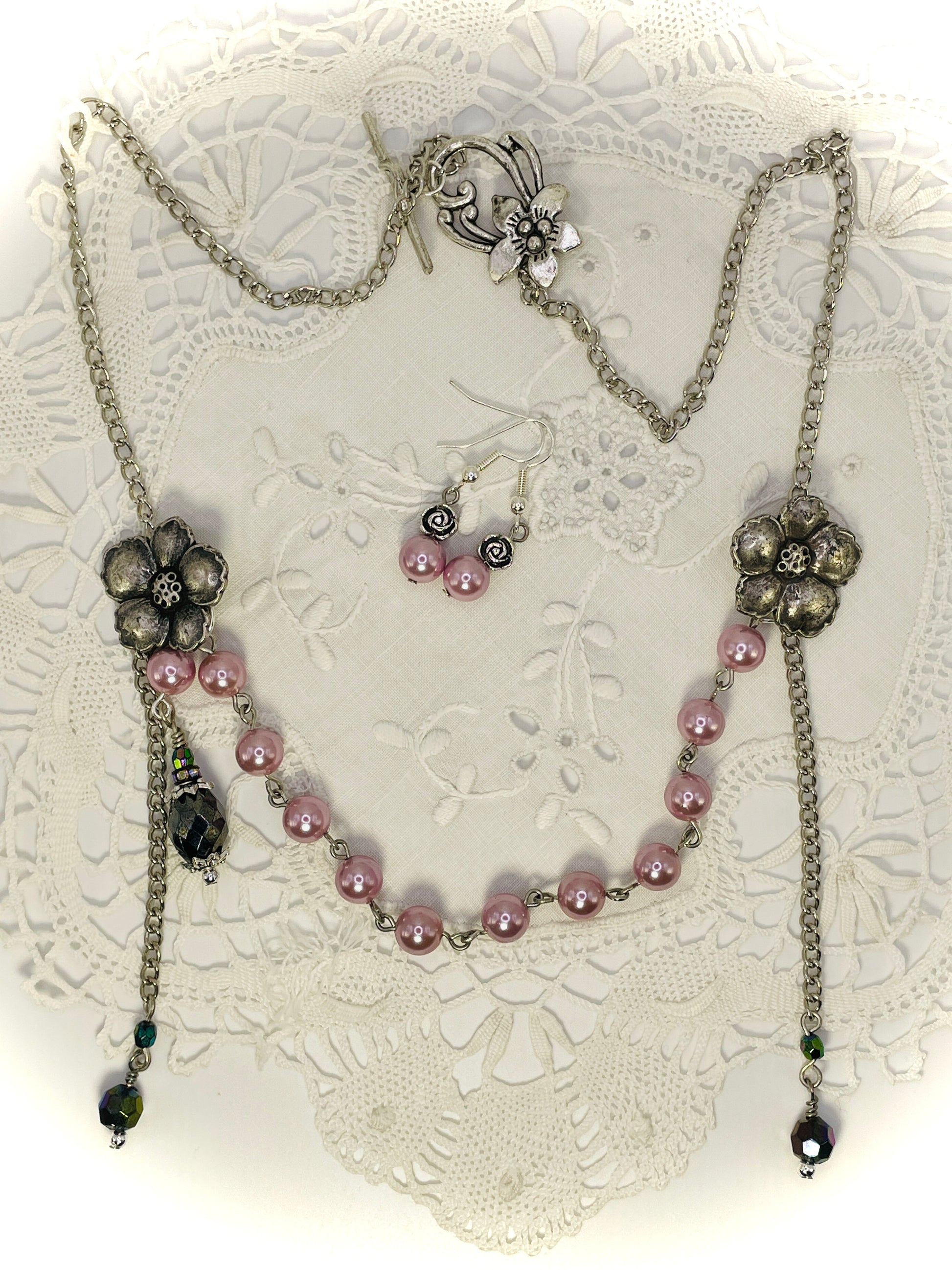 Vintage Rose Necklace 60cm and Earrings 3cm A bit of a 1920's style with the metal flower buttons and the 8mm Light purple imitation pearl rounds with a bit of added bling from the Faceted Hematite ovals finished with a silver plated chain and flower toggle clasp. Earrings have 5mm metal flower bead and 8mm matching imitation pearl.