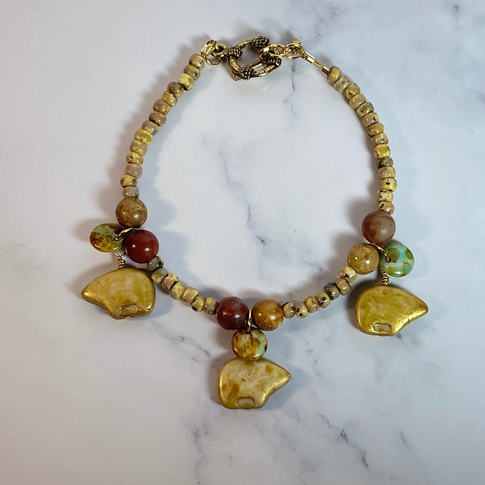 Measures 19cm (7.5") The bear stands for wisdom, for inner strength and overcoming adversity . Bear medicine is one of the most sought after and powerful of all the Zuni fetishes. Czech glass Zuni Bears in a rustic gold picasso finish with a picasso finish lentil, hang from a beaded chain made up of 8mm jasper and 6/0 picasso brown tan seed beads with an antique gold toggle clasp.